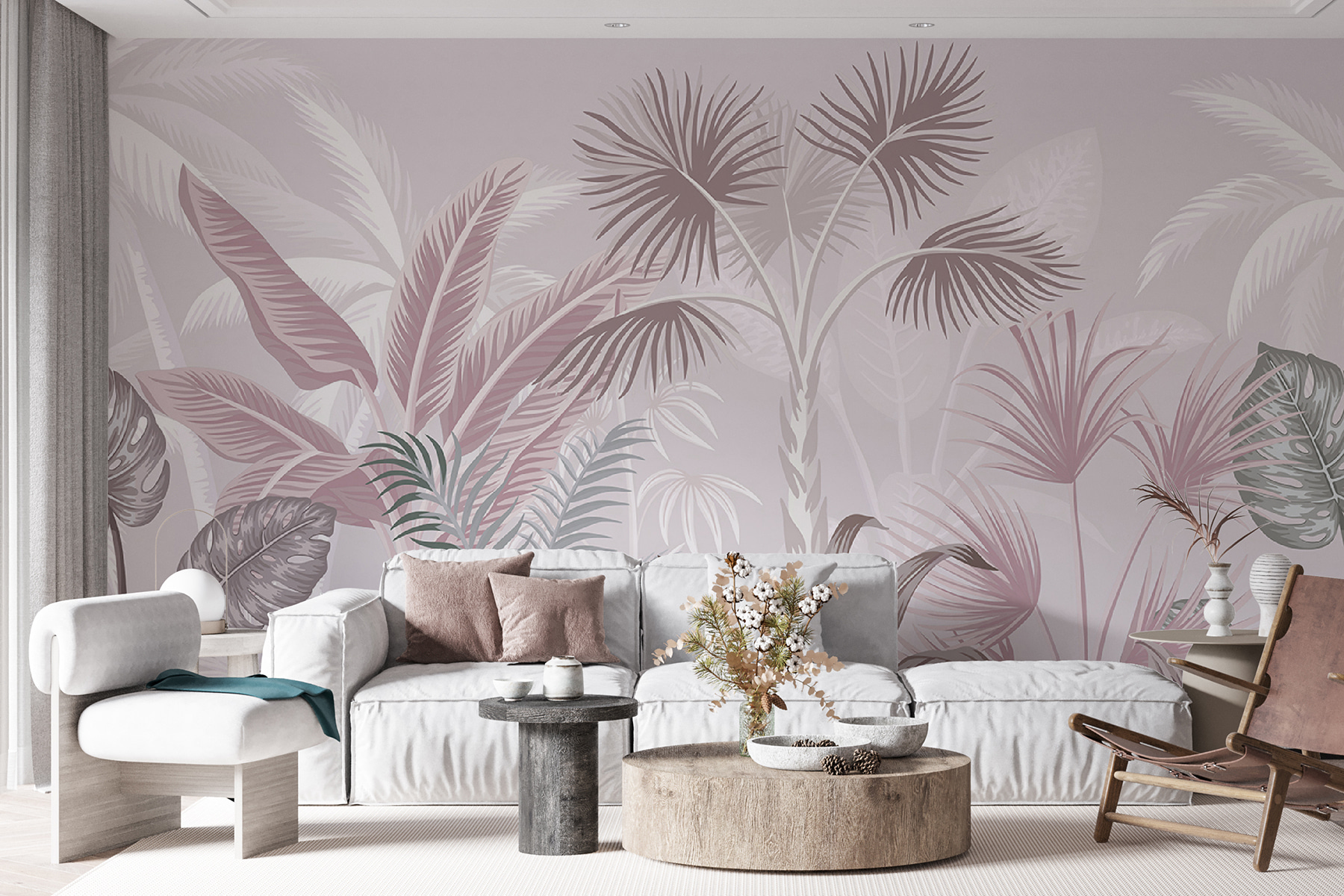 Stel je voor dat je elke ochtend wakker wordt en begroet wordt door de zachte, dromerige tinten van dit botanische ontwerp met pastelkleurige bladeren. Het is alsof je een stukje van een betoverende tuin in huis hebt! Deze muurschildering is perfect voor mensen die houden van een zachte, natuurlijke esthetiek en combineert subtiel roze, groene en beige tinten tot een serene oase.