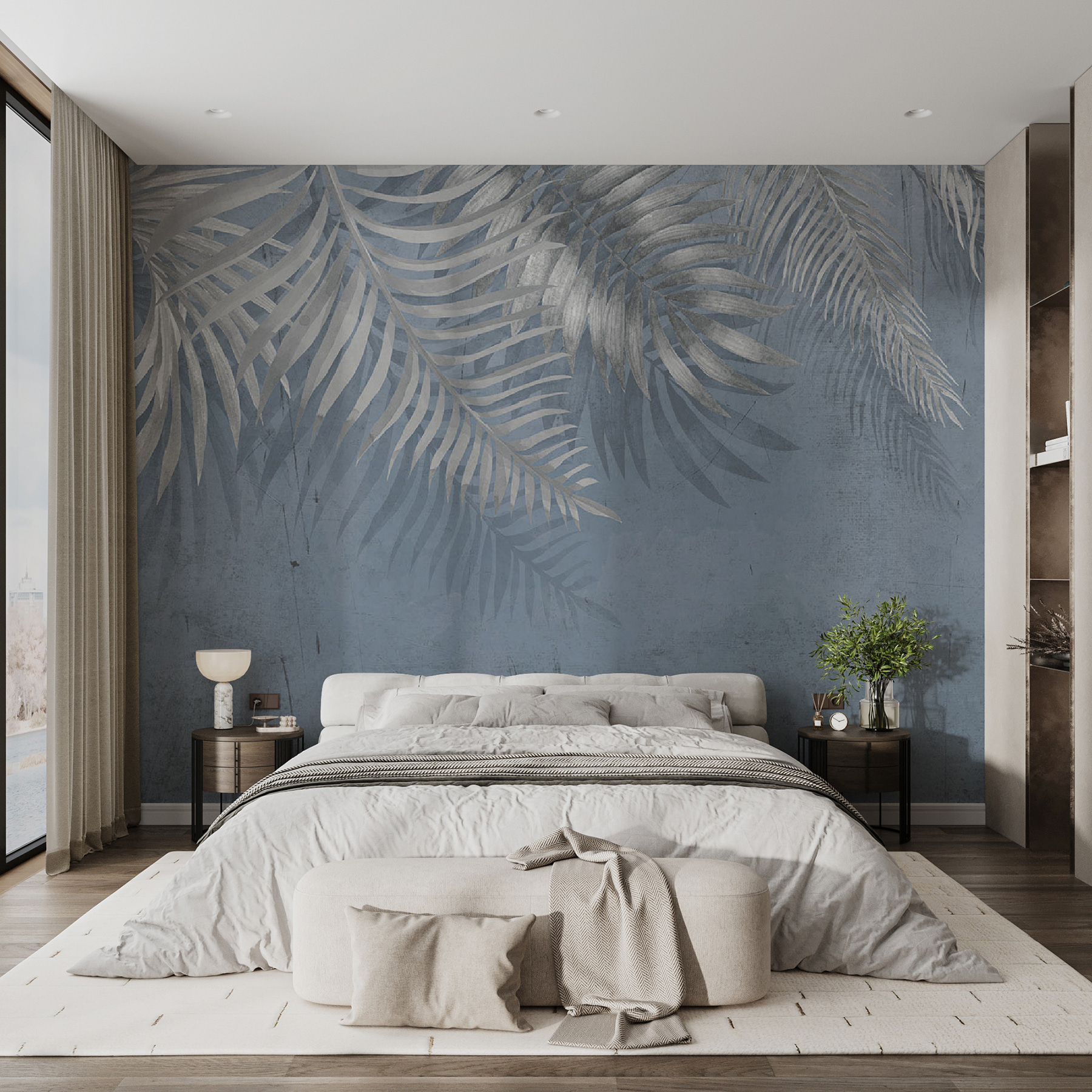 Verander een lege muur in een verfrissende oase met deze levendige muurschildering met rustgevende palmbladeren op een rustige blauwe achtergrond. Stel je voor dat je je meteen rustig voelt als je de kamer binnenstapt en begroet wordt door het sierlijke gebladerte dat zachtjes in je geestesoog wiegt. Het is net een mini-vakantie thuis, zonder de zanderige tenen. Perfect voor woonkamers, slaapkamers of zelfs een knus hoekje waar ontspanning heerst. Combineer het met wat groen en voilà, instant sfeer! Het is niet alleen decoratie, het is een sfeer die fluistert, “Chill out, je hebt het verdiend.” Ik durf te wedden dat zelfs je kamerplanten de upgrade zullen waarderen.