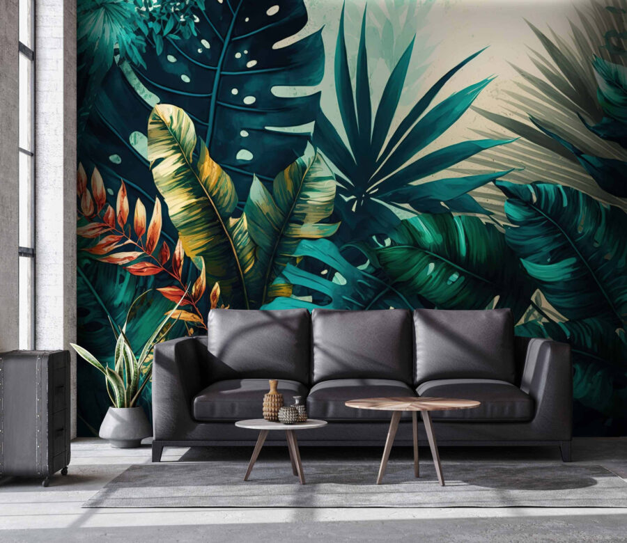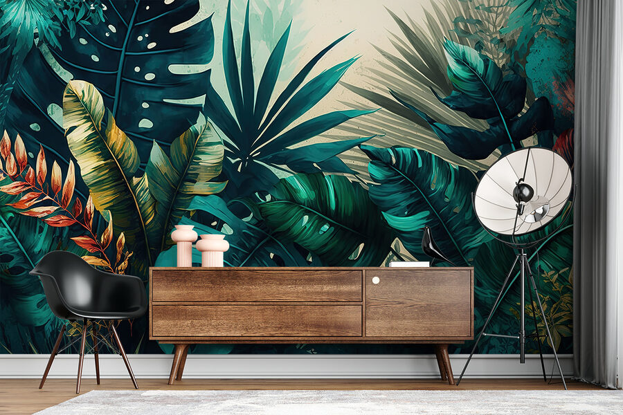 Heb je ooit in een weelderig tropisch paradijs willen ronddwalen zonder je woonkamer te verlaten? Deze muurschildering met de grillige naam “Levendig tropisch gebladerte in harmonie” kan jouw persoonlijke magische portaal zijn. Stel je voor: je drinkt ‘s ochtends koffie en geniet van de serene sfeer van grote palmbladeren en kleurrijk gebladerte die samen op je muren lijken te dansen. Het heeft een junglegevoel zonder de echte insecten. Ideaal voor iedereen die een beetje natuur wil, maar het liever binnenshuis houdt. Voel je net Tarzan – of Jane – terwijl je door het groen slingert, of laat de felle kleuren je ruimte gewoon opfrissen. Perfect voor die opvallende muur die er een beetje saai uitziet, vind je niet?