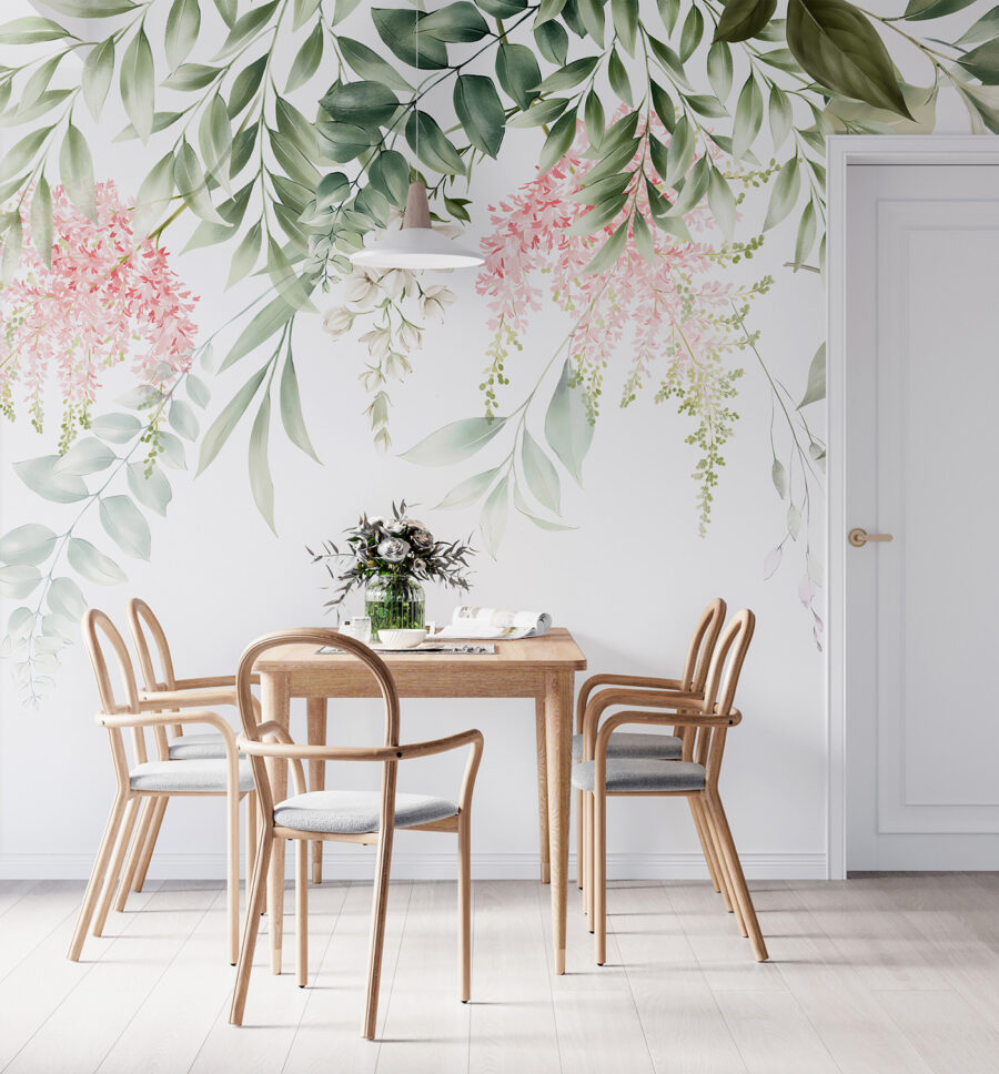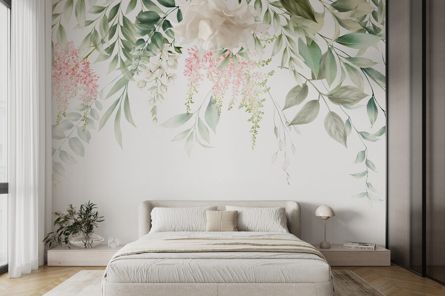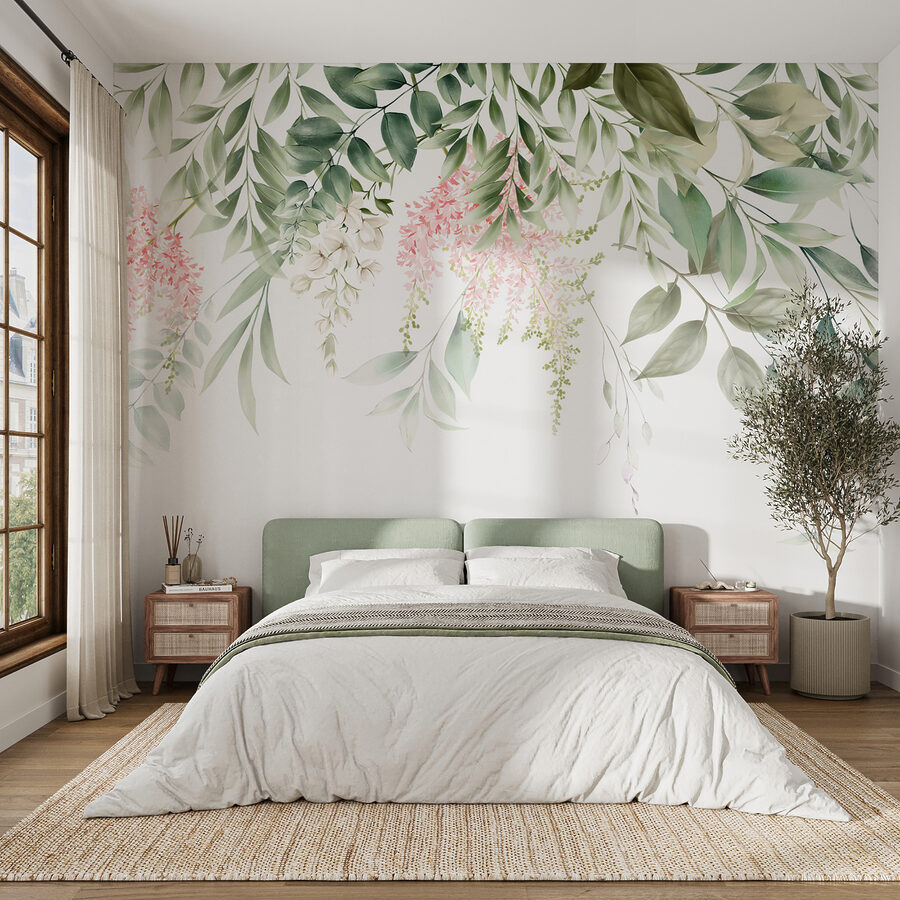 Stel je voor dat je een kamer binnenloopt en je onmiddellijk gekalmeerd voelt door deze elegante bloemenmuurschildering. Zachte roze en groene tinten vallen als een zacht briesje over de muur. Het is de perfecte mix – modern en toch tijdloos. Geweldig voor een woonkamer, slaapkamer of zelfs een stijlvol kantoor aan huis. De delicate bladeren en bloesems geven je het gevoel dat je in een zonnige botanische tuin zit, zelfs op de meest regenachtige dagen. Dus als je op zoek bent naar een vleugje magie geïnspireerd op de natuur, dan is deze muurschildering misschien precies wat je nodig hebt.