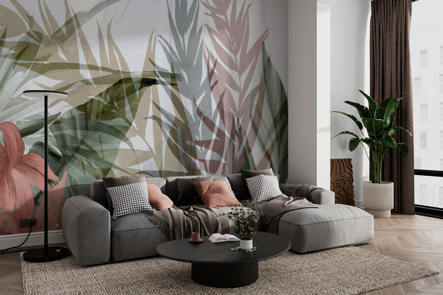 Stel je eens voor: een muurschildering die je muur omtovert tot een serene oase. Maak kennis met ons abstracte bloemendesign met gelaagde bladeren. Het is net een mini-vakantie telkens als je de kamer binnenloopt. Die zachte lagen bladeren en bloemen – het lijkt wel een zacht briesje dat door een tropisch bos ruist. De gedempte kleuren versmelten in een rustgevende dans, waardoor elke ruimte fris en rustig aanvoelt.