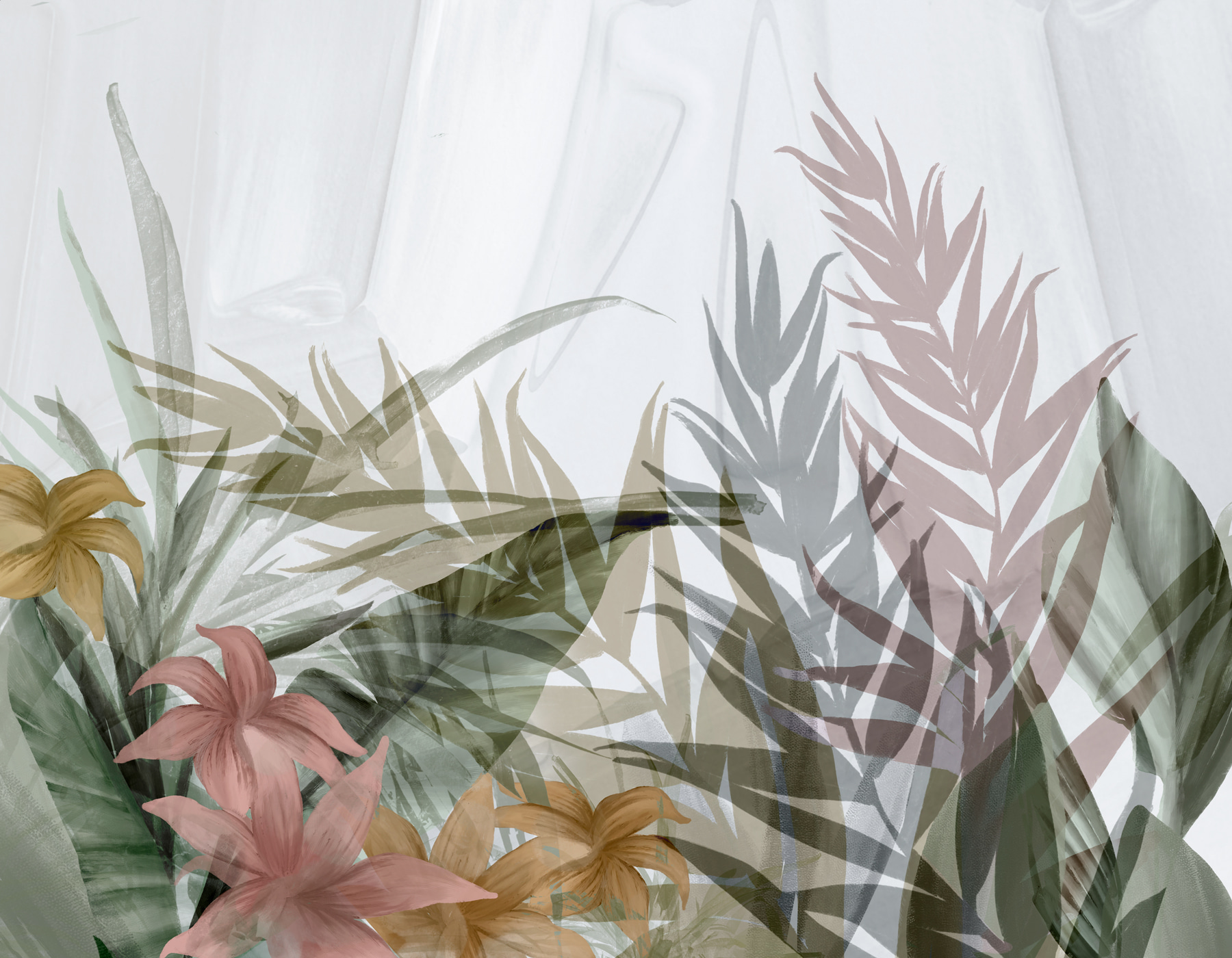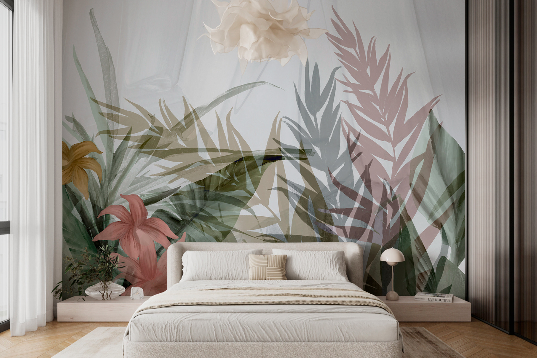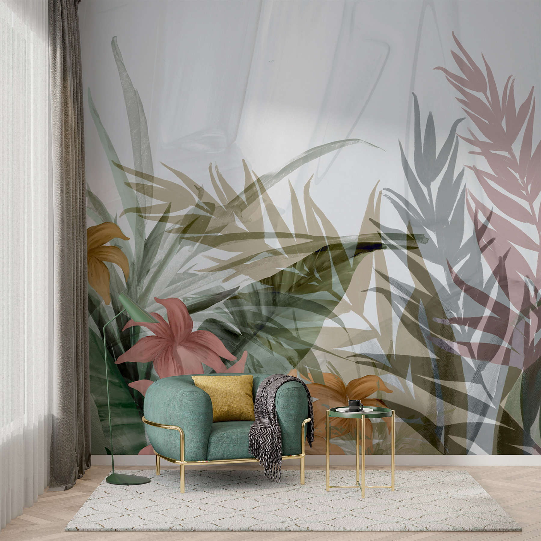 Stel je eens voor: een muurschildering die je muur omtovert tot een serene oase. Maak kennis met ons abstracte bloemendesign met gelaagde bladeren. Het is net een mini-vakantie telkens als je de kamer binnenloopt. Die zachte lagen bladeren en bloemen – het lijkt wel een zacht briesje dat door een tropisch bos ruist. De gedempte kleuren versmelten in een rustgevende dans, waardoor elke ruimte fris en rustig aanvoelt.