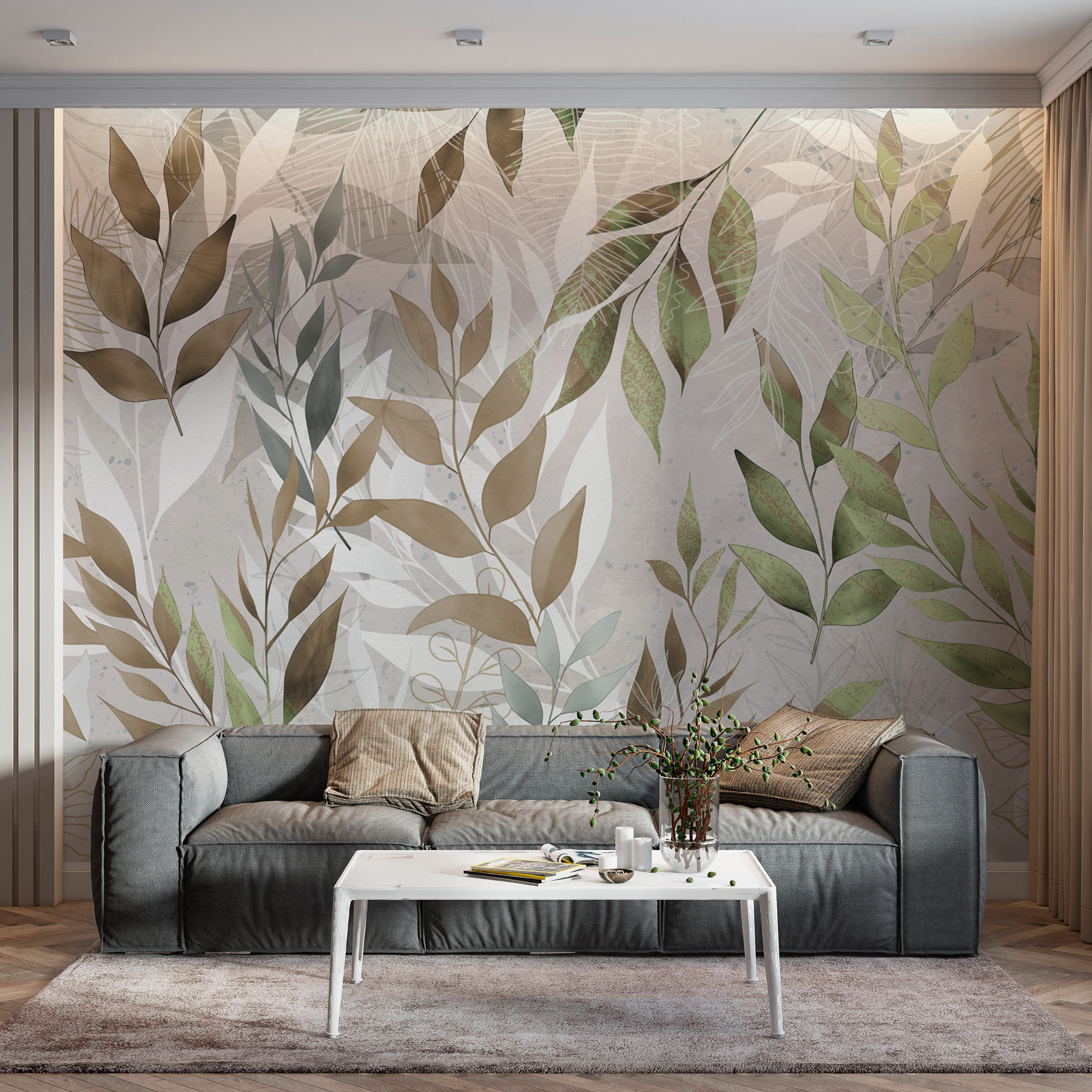 De kleuren zijn zacht maar levendig groen en bruin, perfect gemengd voor die moeiteloos coole look. Elke keer als je er naar kijkt, voel je je een beetje meer ontspannen, alsof je een mini-vakantie neemt. Geweldig voor mensen die van de schoonheid van de natuur houden maar niet altijd buiten kunnen zijn. Deze muurschildering decoreert niet alleen, het creëert een ervaring – stel je gezellige ochtenden met koffie voor, of avonden met zachte muziek, omringd door dit prachtige bladerkunstwerk. Perfect om bij weg te dromen.