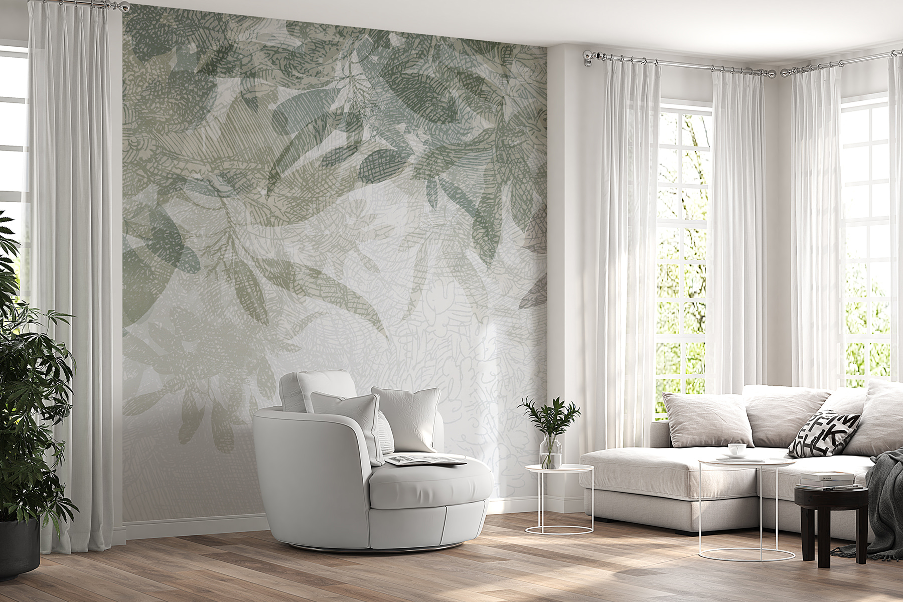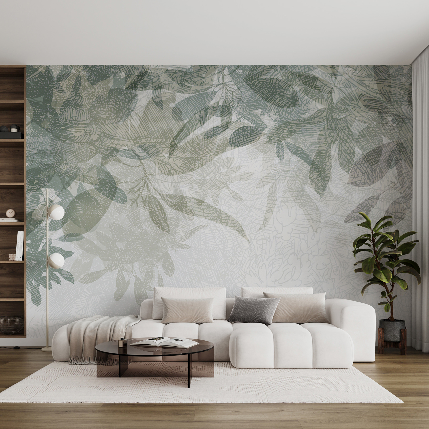 Stel je voor: je loopt je woonkamer binnen en wordt begroet door zachte, schaduwrijke bladeren die een vredige sfeer uitstralen. Het is bijna alsof je de natuur binnen hebt – zonder de insecten. Of je nu ‘s ochtends koffie drinkt of ‘s avonds een boek leest, deze muurschildering geeft je dat rustgevende gevoel. Hij is subtiel, maar valt toch op en voegt diepte toe aan elke ruimte.