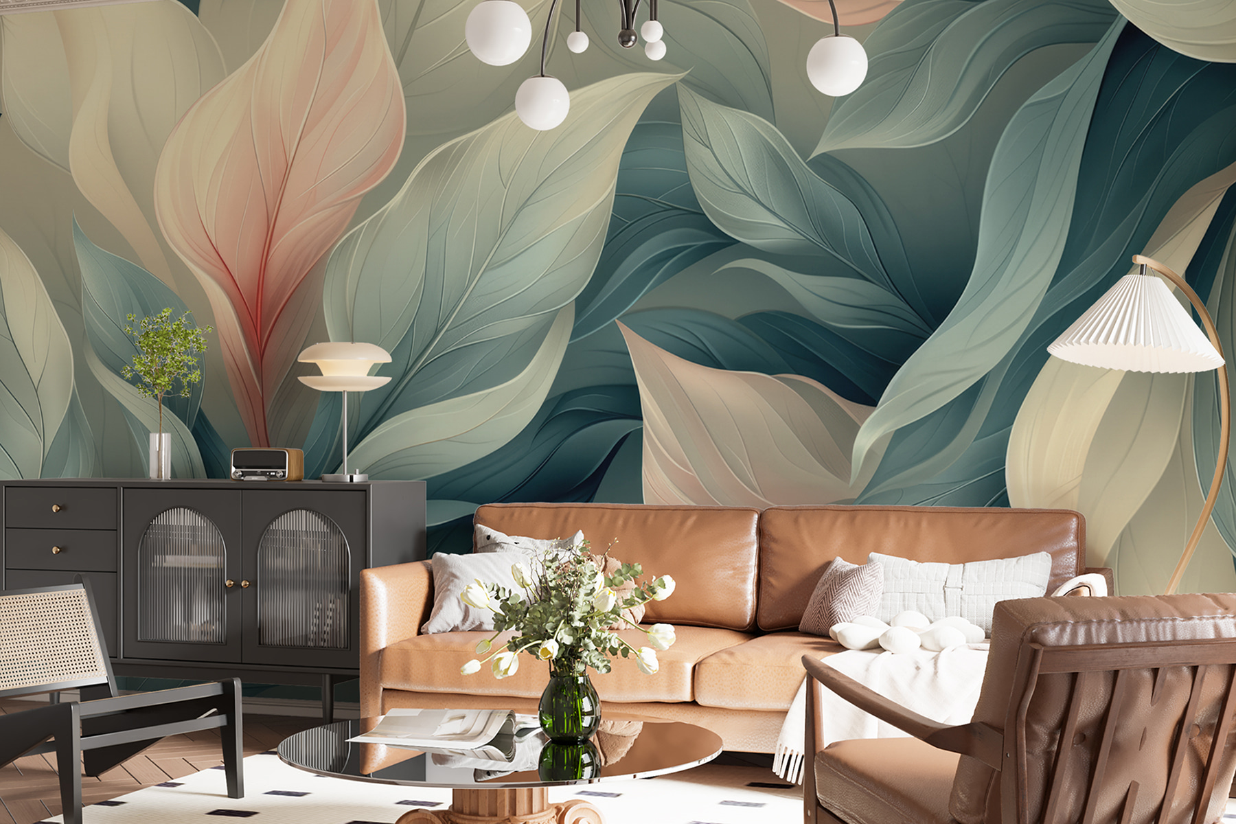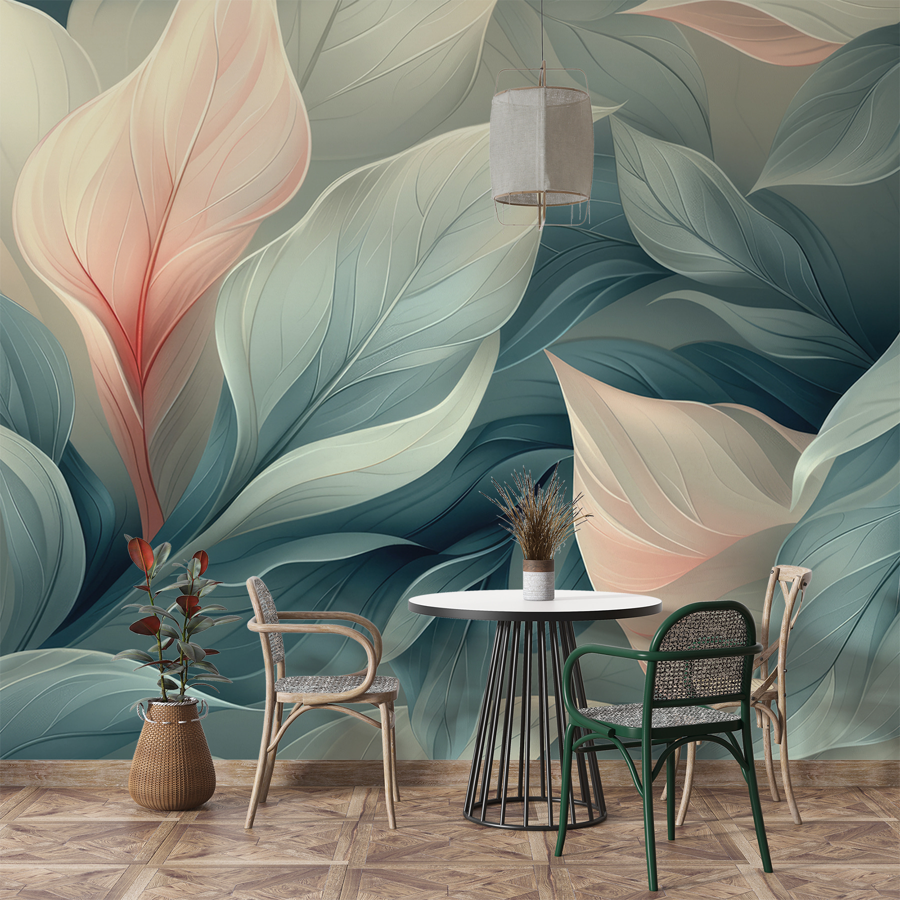 Tover elke ruimte om in een serene oase met de muurschildering Ethereal Leaves. Dit ontwerp omhult de muren met zachte pasteltinten en dromerig gebladerte en creëert een vredige sfeer die aanvoelt als een zachte knuffel. Stel je voor dat je thee drinkt terwijl je luiert in een kamer die rust uitstraalt. Perfect om tot rust te komen na een lange dag of om een gezellige sfeer te creëren voor een regenachtige middag. De delicate bladeren dansen over de muur en nodigen de natuur uit om binnen te komen. Het is alsof je een stukje serene tuin in huis haalt – zonder dat je groene vingers nodig hebt! Perfect voor woonkamers, slaapkamers of elk ander hoekje dat een vleugje rust nodig heeft.