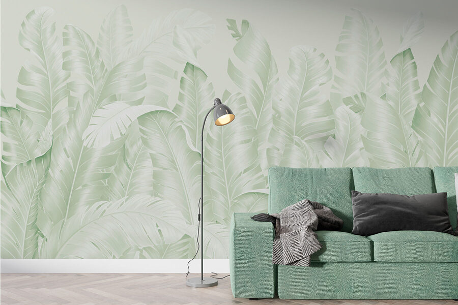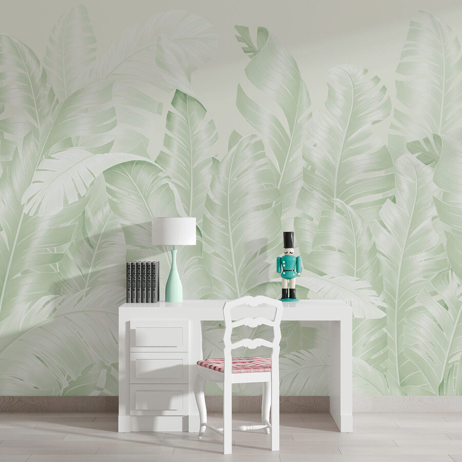 Verander je ruimte in een serene oase met deze charmante muurschildering met een weelderige groep bladeren tegen een zacht witte achtergrond. Elke keer dat je de kamer binnenloopt, waan je je in een tropisch oord. Het zachte groen en wit creëren een rustgevende sfeer, perfect om tot rust te komen na een lange dag. Het is alsof je een stukje natuur aan de muur hebt hangen, waardoor de kamer groter en uitnodigend aanvoelt. Vrienden zullen zich afvragen of je een geheime tuin hebt. Bovendien past het prachtig bij elke interieurstijl. Stel je voor dat je hier koffie drinkt, omringd door de rust van de natuur – pure gelukzaligheid!