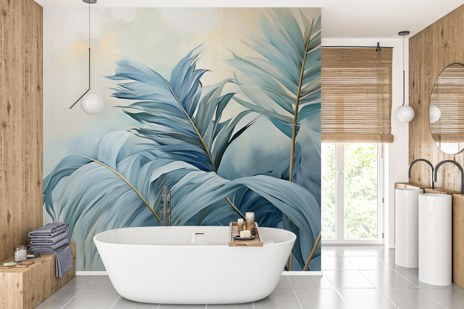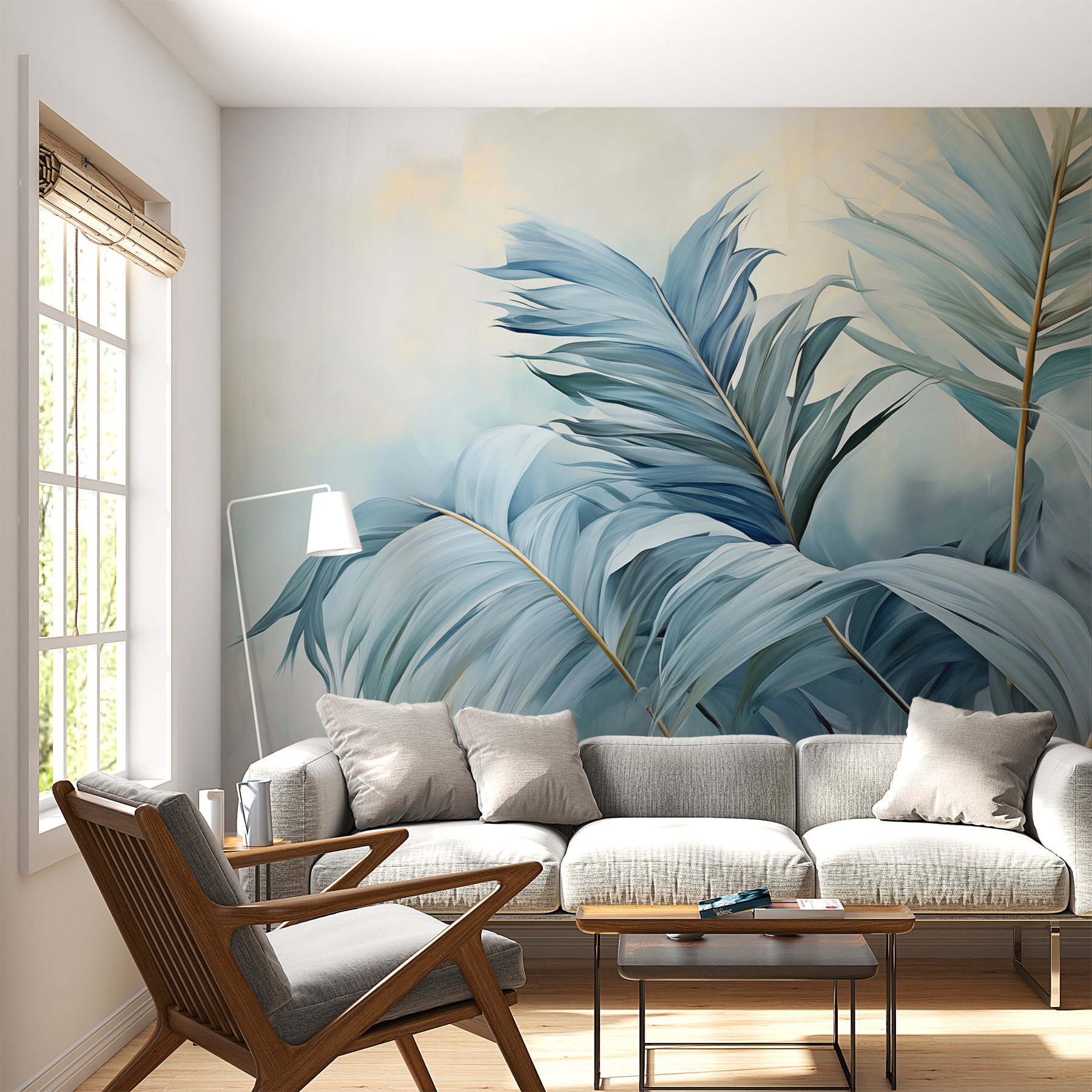 Stel je voor dat je elke ochtend wakker wordt met de “Whispers of Blue Palms” – het is alsof je een serene jungle binnenstapt, gewoon in je woonkamer. De rustgevende blauwe en groene tinten zijn perfect om een zen-hoek te creëren waar je ‘s ochtends aan je koffie kunt nippen of tot rust kunt komen na een lange dag. Je zou zelfs kunnen gaan denken dat je ruimte zijn eigen exotische toevluchtsoord heeft. Vogels zullen jaloers zijn op deze bladeren! Bovendien is het zo veelzijdig dat het bij bijna elke decoratiestijl past. Verander een gewone muur in een zachte ontsnapping gehuld in de zachtste tinten van de natuur.