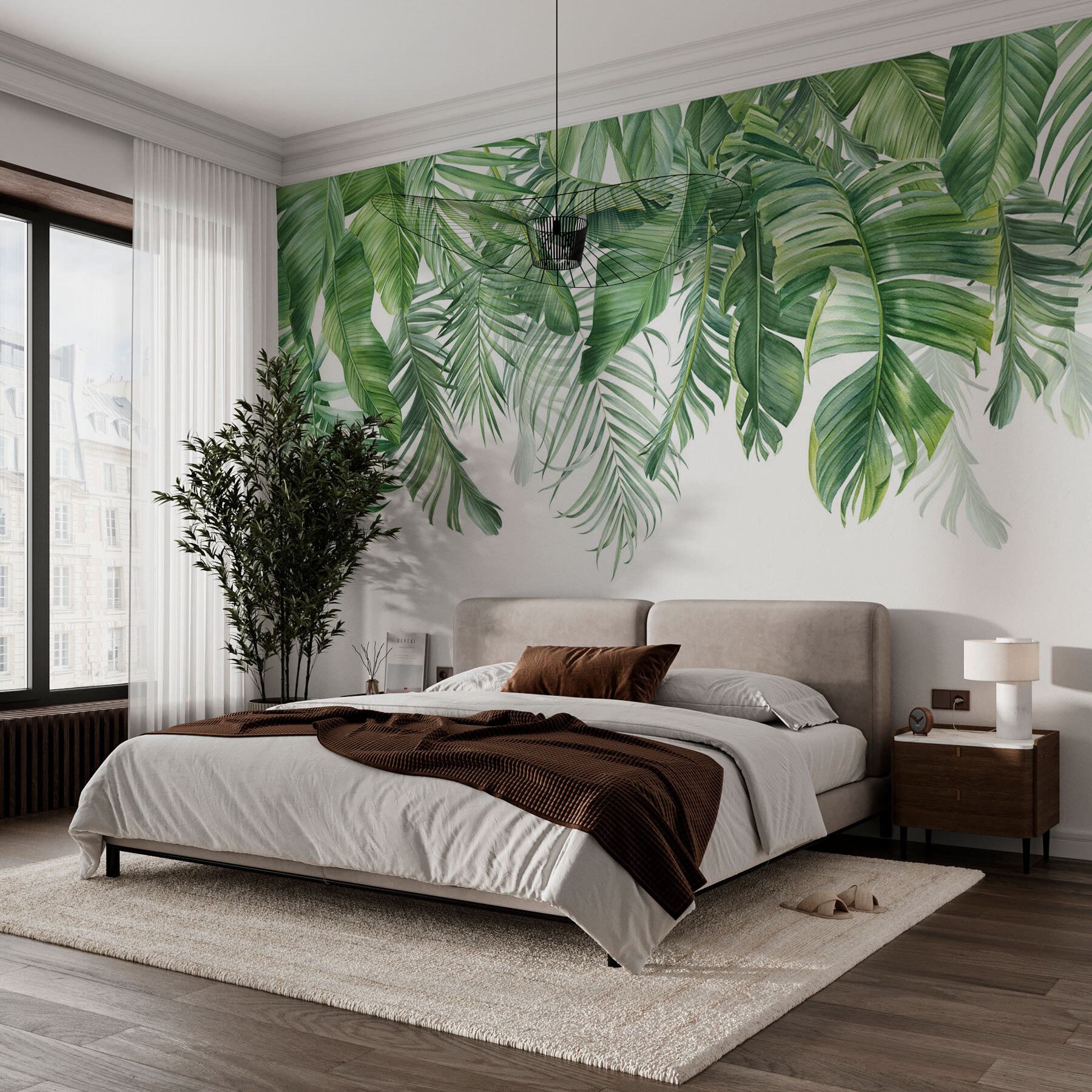 Stel je voor dat je een kamer binnenloopt en meteen het gevoel hebt dat je midden in een tropisch woud zit. Dat is wat de “Fotobehang Row of Green Leaves” doet: het brengt het buitenleven naar je leefruimte. Deze muurschildering is als een koel briesje op een warme dag, verfrissend en rustgevend. De weelderige groene bladeren voegen een vleugje levendige natuur toe, perfect om die saaie witte muren op te breken. Een geweldige gespreksstarter ook: vrienden vragen je misschien of je stiekem een botanicus bent geworden! Perfect om een vleugje leven toe te voegen, zonder dat je water hoeft te geven.