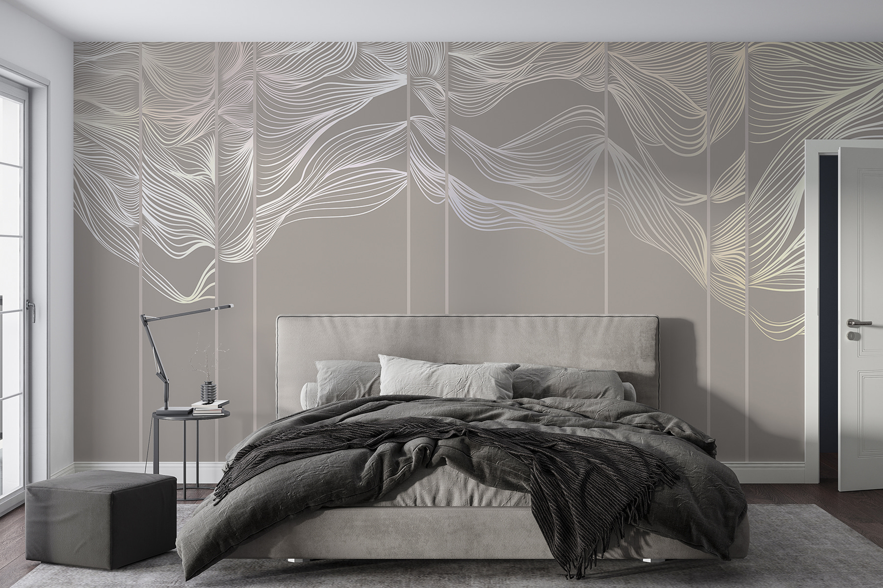 Stel je voor dat je een kamer binnenstapt waar rustgevende golven over de muren fluisteren – betreed de wereld van “Elegante golven in monochrome tinten”. De delicate wervelingen van deze muurschildering weerspiegelen het ritme van de natuur, alsof je op het strand staat (zonder het zand in je schoenen). Perfect om elke ruimte om te toveren in een vredig toevluchtsoord. Het is als een zachte omhelzing van je muren – comfortabel en chic! Of je nu een dromerig toevluchtsoord ontwerpt of gewoon een stijlvolle achtergrond wilt voor zoombellen, deze elegante golven maken elke dag een beetje meer sereen.