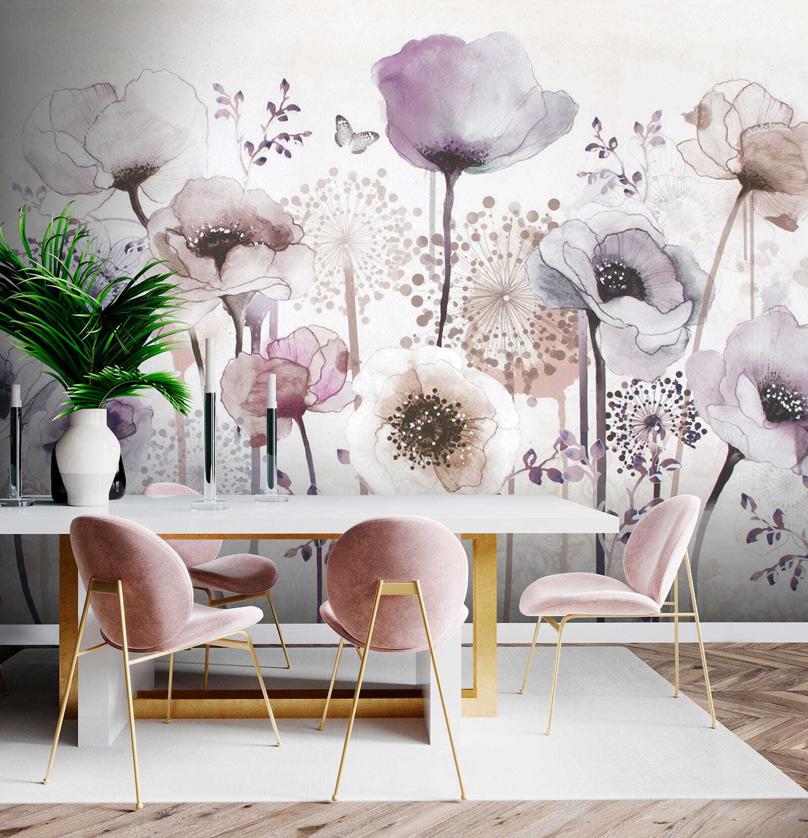 Is deze muurschildering niet dromerig? Stel je voor dat je je kamer binnenstapt en het gevoel hebt dat je in een betoverende tuin bent beland. “Delicate Watercolor Flowers and Butterflies” geeft de charme weer van een serene weide, met zachte bloemblaadjes in lavendel- en bloesschakeringen. Die kleine vlinders voegen zo’n grillig tintje toe – alsof ze op het punt staan weg te fladderen! Deze muurschildering is perfect voor een slaapkamer of een gezellig leeshoekje en brengt rust en schoonheid samen. Vrienden zullen denken dat je het uren zelf hebt geschilderd… en het is prima om ze dat te laten geloven!