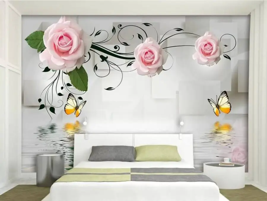 Stel je voor dat je elke dag wakker wordt met deze prachtige muurschildering! “Fotobehang Roses and Butterflies by the Water” is alsof je een stukje rustige natuur in huis hebt. Zachtroze rozen zweven boven weerspiegelend water met delicate vlinders die rondfladderen – het is een dromerig tafereel dat je ruimte direct tot rust brengt. Perfect voor een slaapkamer of een gezellig leeshoekje; een plek waar het nog beter voelt om in een boek te duiken met deze schoonheid aan je muur. Het is bijna alsof je de rozen kunt ruiken en het zachte fladderen van vlindervleugels kunt horen… Ah, pure gelukzaligheid!