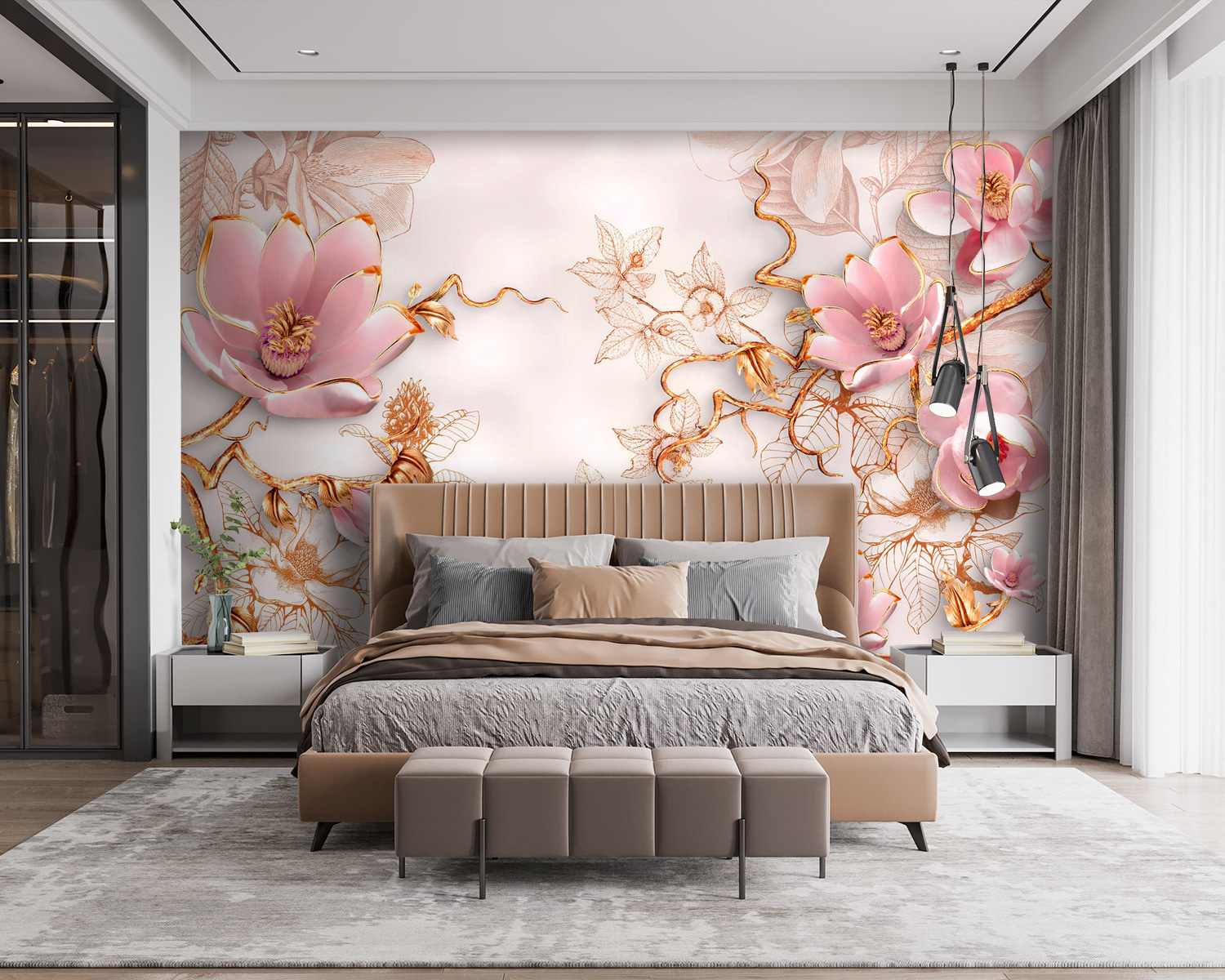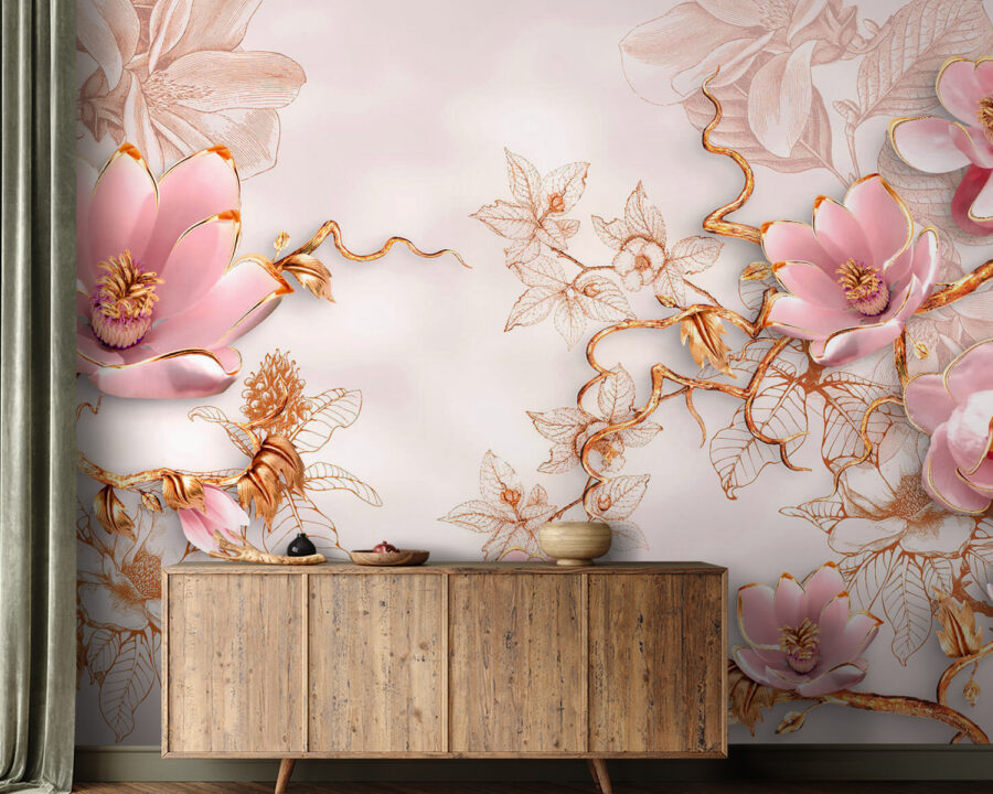 Stel je voor dat je een kamer binnenstapt waar bloeiende roze bloemen dansen op een zachte witte achtergrond, die warmte en charme uitstraalt. Deze muurschildering legt de essentie van een serene tuin vast, met delicate bloemblaadjes en kronkelende klimplanten die bijna zoete geheimen lijken te fluisteren. Het is alsof je een stukje natuur naar binnen haalt, waardoor elke ruimte luchtig en licht aanvoelt. Perfect voor een gezellig hoekje of een levendige woonkamer, het kan vreugde opwekken en een rustige sfeer creëren. Stel je voor dat je hier, omringd door schoonheid, geniet van een rustig kopje thee. Fris, bloemig en net een tikje speels – wat is er niet leuk aan?
