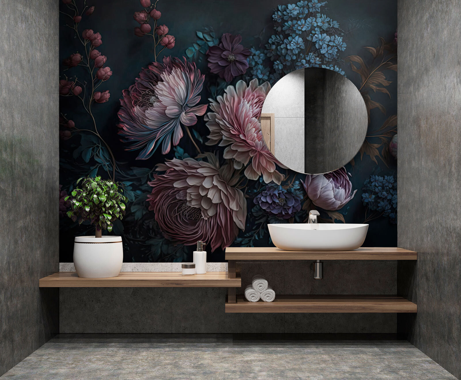 Verander een saaie muur in een botanisch wonderland met deze levendige bloemenmuurschildering. Weelderige bloemen in rijke, donkere tinten nodigen uit tot een gezellige sfeer die aanvoelt als een geheime tuin – perfect om in weg te dromen of een rustig moment te nemen. Stel je voor dat je een bijeenkomst organiseert en iedereen blijft kletsen over die prachtige bloemblaadjes. De manier waarop de kleuren dansen met het licht zorgt ervoor dat je uren achterover wilt leunen en thee wilt drinken. Een geweldige gespreksstarter! Je muren verdienen een beetje liefde en deze muurschildering zou wel eens het ticket kunnen zijn voor een onverwachte, mooie connectie.
