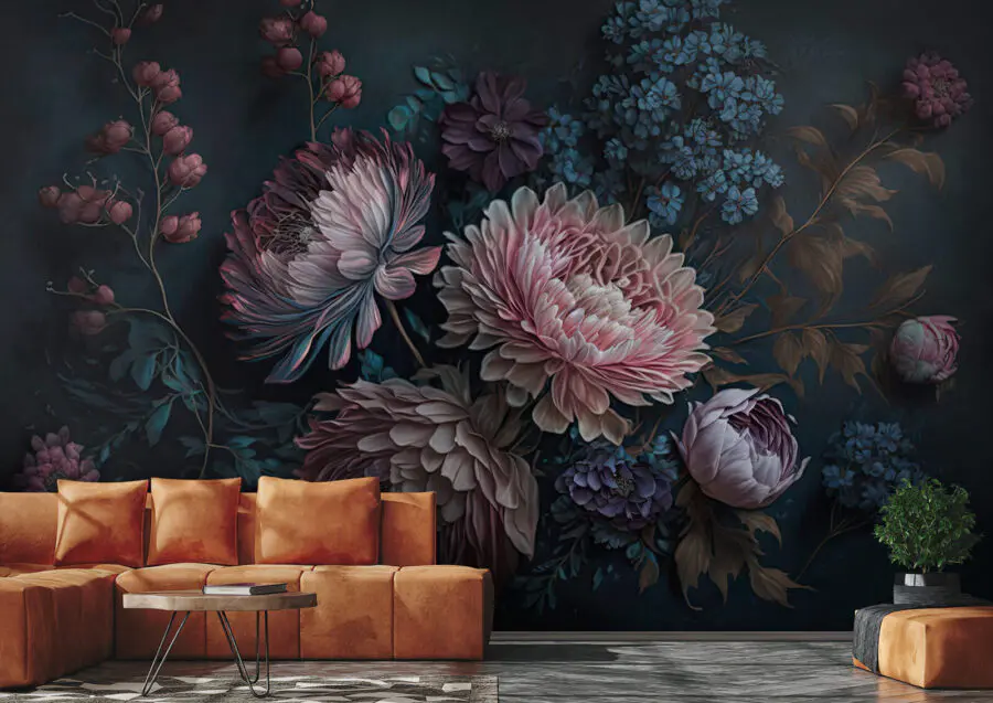 Verander een saaie muur in een botanisch wonderland met deze levendige bloemenmuurschildering. Weelderige bloemen in rijke, donkere tinten nodigen uit tot een gezellige sfeer die aanvoelt als een geheime tuin – perfect om in weg te dromen of een rustig moment te nemen. Stel je voor dat je een bijeenkomst organiseert en iedereen blijft kletsen over die prachtige bloemblaadjes. De manier waarop de kleuren dansen met het licht zorgt ervoor dat je uren achterover wilt leunen en thee wilt drinken. Een geweldige gespreksstarter! Je muren verdienen een beetje liefde en deze muurschildering zou wel eens het ticket kunnen zijn voor een onverwachte, mooie connectie.