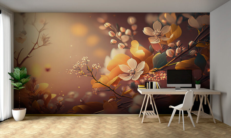 Stel je voor dat je een kamer binnenstapt waar de muren bloeien met delicate, warmgekleurde bloesems. Deze muurschildering “Delicate Blossoms” tovert elke ruimte om in een stralend bloemenparadijs. Perfect voor die grijze winterdagen waarop een vleugje lente voelt als een warme knuffel van een vriend. De zachte tinten van geel, oranje en subtiel groen dansen over de muurschildering en voegen diepte en een zacht gevoel van beweging toe. Het is alsof je een tuin hebt die nooit verwelkt, gewoon in je woonkamer. Stel je een gezellige leeshoek voor of zelfs een slaapkamer – elke blik op deze bloesems is een zoete herinnering aan de schoonheid van de natuur. Bovendien heeft het iets uitnodigends en rustgevends. Deze muurschildering versiert niet alleen een muur, maar brengt een gevoel van sereniteit en zachte vreugde in je huis. Een dagelijkse dosis bloemengenot zonder gieter! 🌸