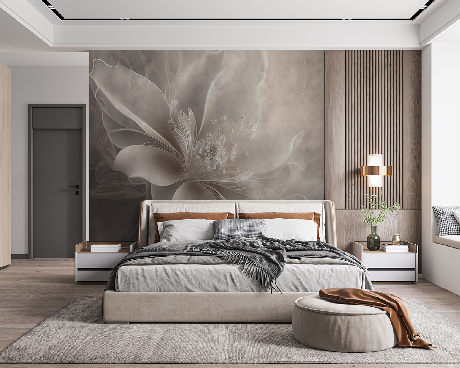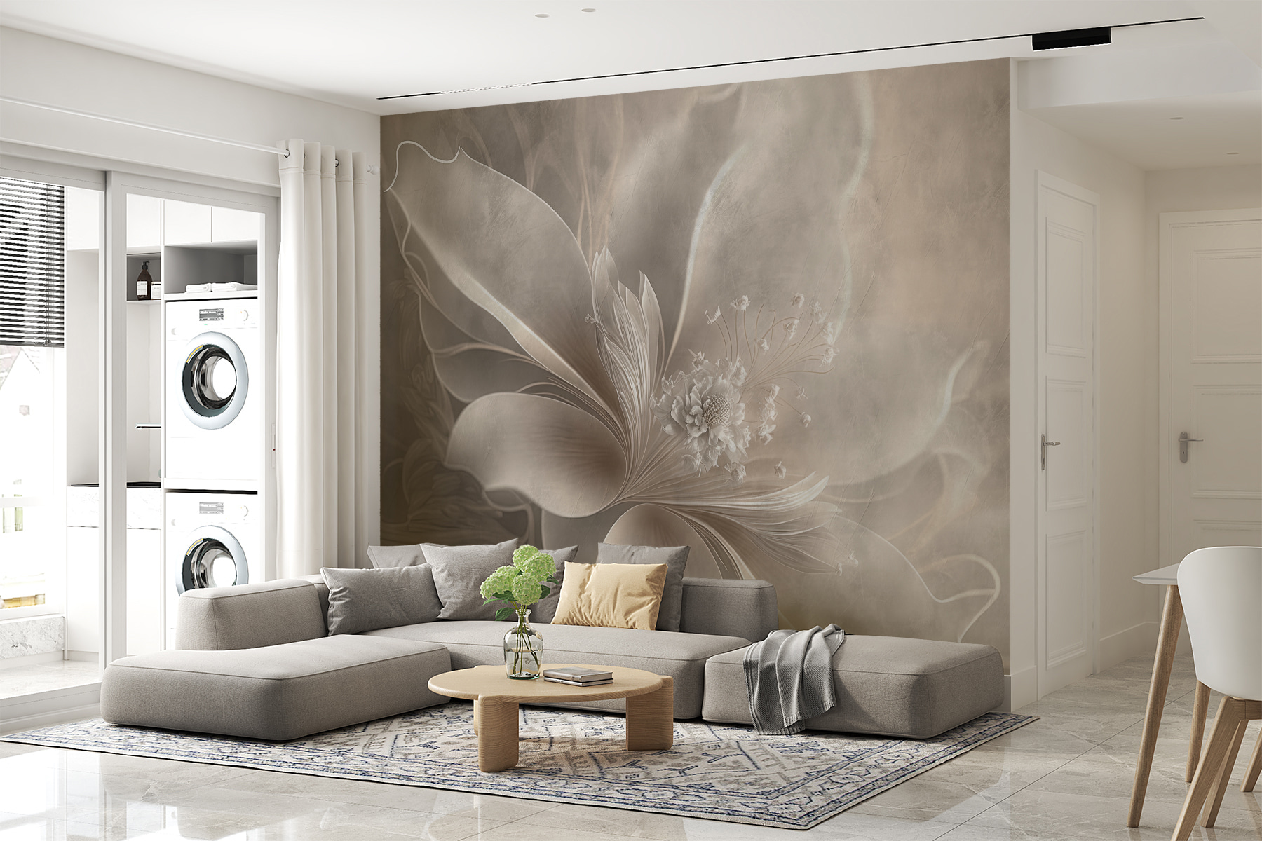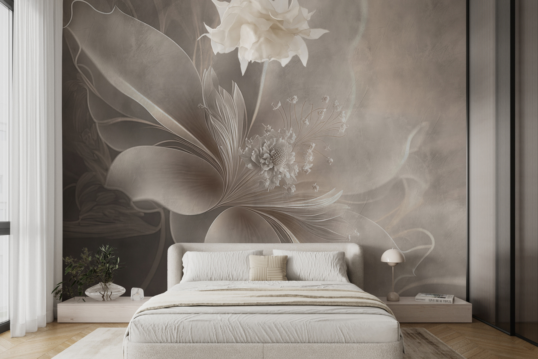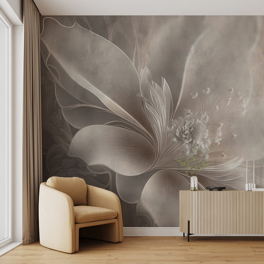 Stel je een muur voor die elegantie uitstraalt. Deze muurschildering “Elegante bloemblaadjes in zachte sepiatinten” doet precies dat. Het is alsof je een kamer binnenstapt, gehuld in een zachte, dromerige knuffel. Stel je zachte, sierlijke bloemblaadjes voor die bevroren zijn in de tijd; ze passen naadloos in je ruimte en creëren een sfeer van serene romantiek. Perfect voor iedereen die wil dat zijn huis aanvoelt als een rustig toevluchtsoord.