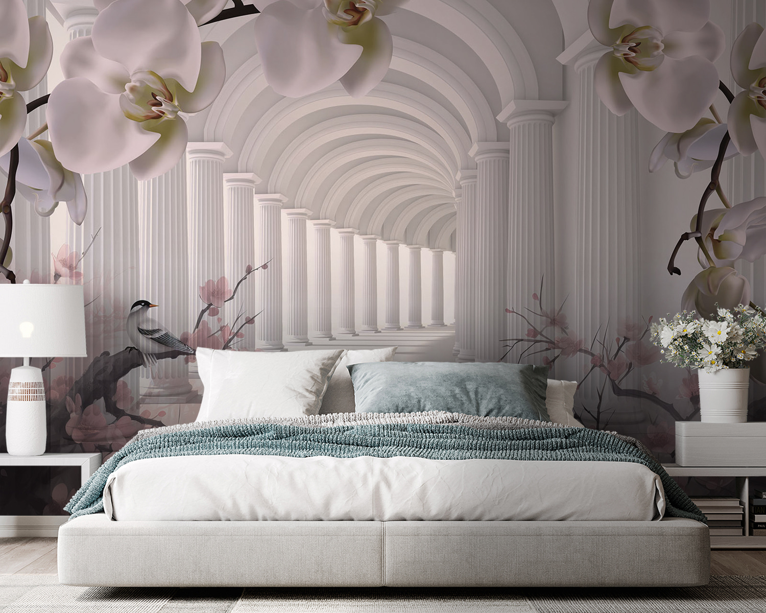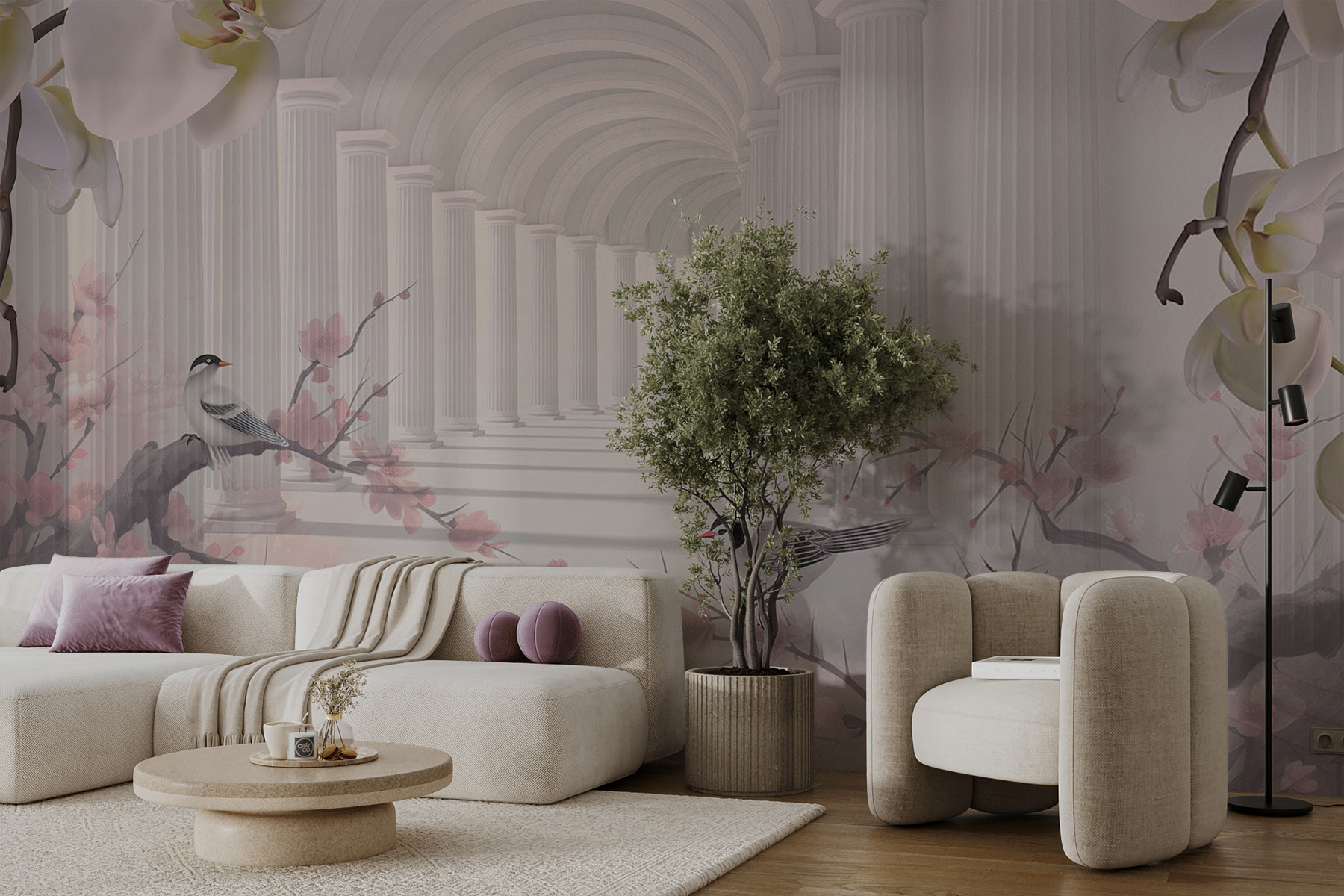 Stel je voor dat je door een elegante boog loopt, omringd door bloeiende bloemen en het zachte gefluister van vogels – maar dan in je eigen woonkamer! Deze “Elegante boog met bloeiende bloemen” muurschildering verandert elke ruimte in een dromerige ontsnapping. Denk aan de romige zuilen, de delicate bloesems en de charmante vogeltjes die een vredige sfeer creëren. Het is alsof je een sprookjestuin binnenstapt wanneer je de kamer binnenkomt. Perfect voor iedereen die houdt van een vleugje natuur en een vleugje klassieke schoonheid. Je voelt bijna de zachte bries en de zachte geur van bloemen. Stel je voor dat je met een kopje thee in je bank wegzakt en je in een andere wereld waant. Deze muurschildering met zijn serene en gracieuze uitstraling geeft je zin om diep adem te halen en te ontspannen. Een echte blikvanger voor elke muur!