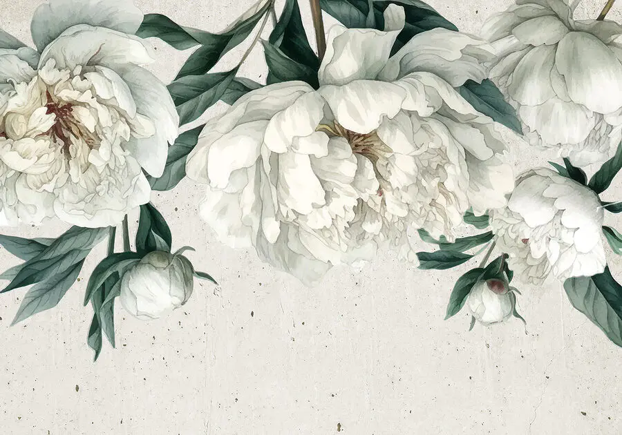 Transformeer elke kamer met deze prachtige muurschildering met witte pioenrozen tussen weelderige groene bladeren. Stel je voor dat je de ruimte binnenstapt en het gevoel hebt dat je net een serene tuin bent binnengestapt – wat een heerlijke sfeer! Deze muurschildering is niet zomaar een decorstuk; het vertelt een verhaal van elegantie en rust. De zachte bloemblaadjes fluisteren bijna ontspanning, waardoor het perfect is voor een gezellige leeshoek of een uitnodigende woonkamer.