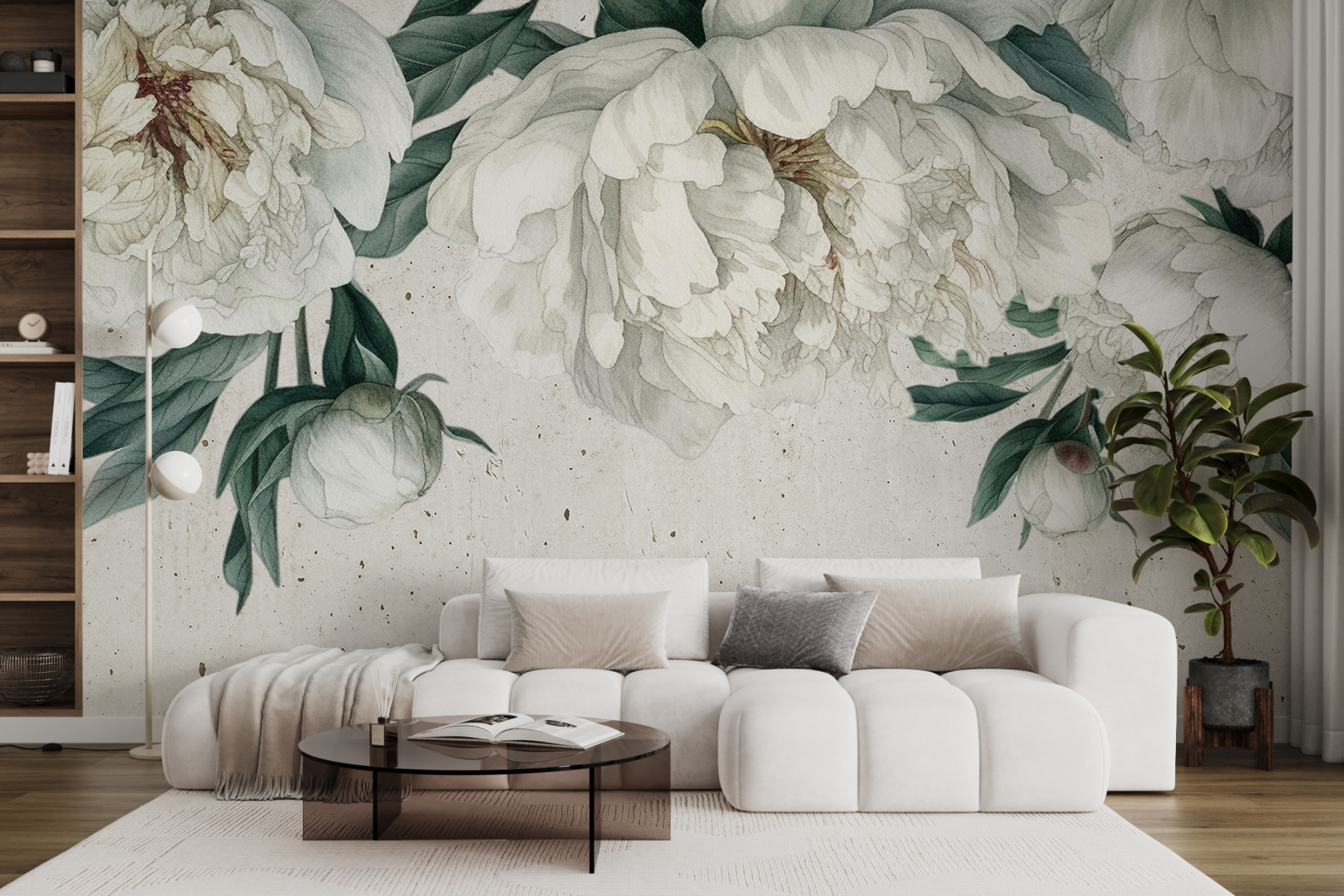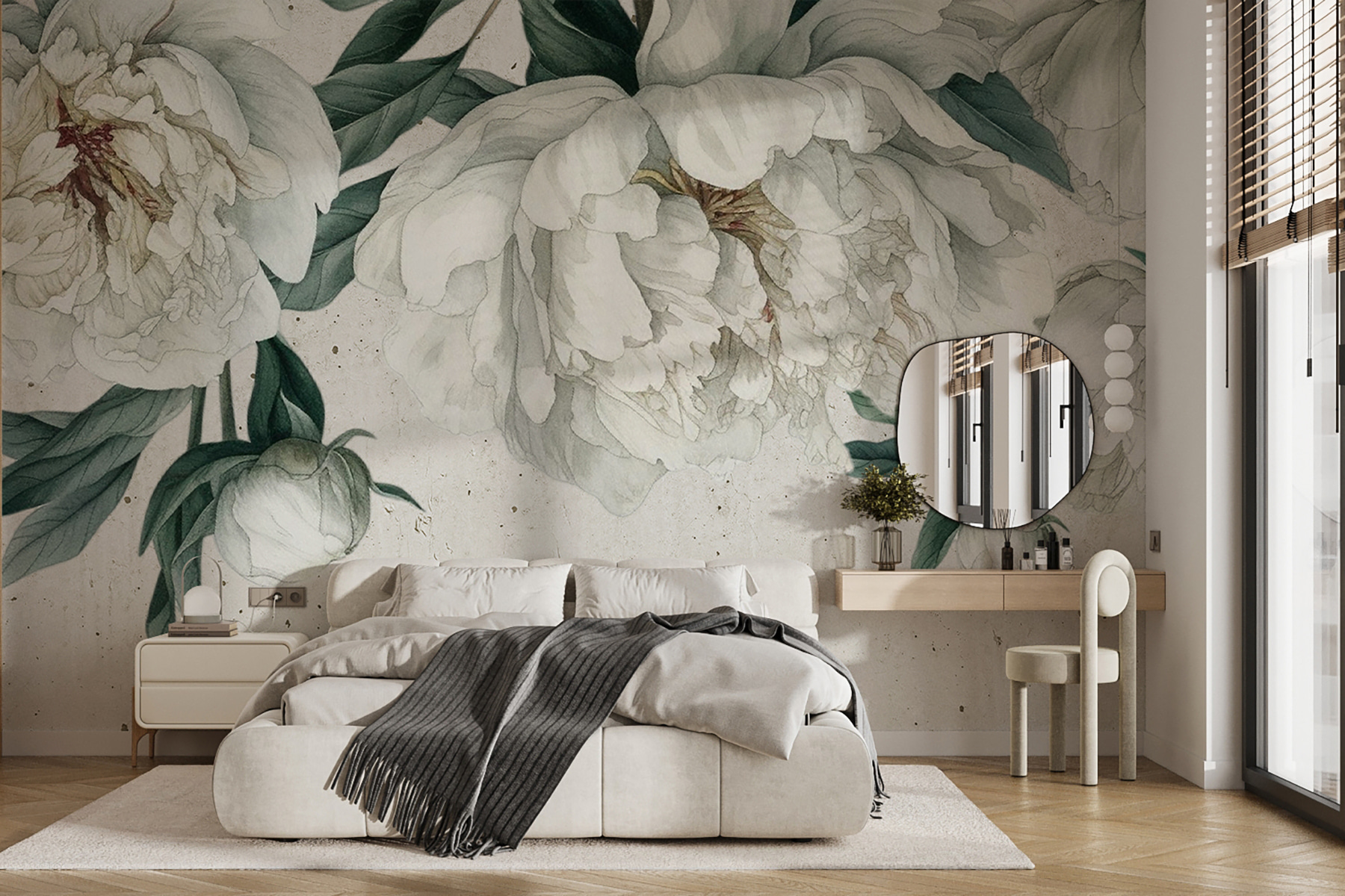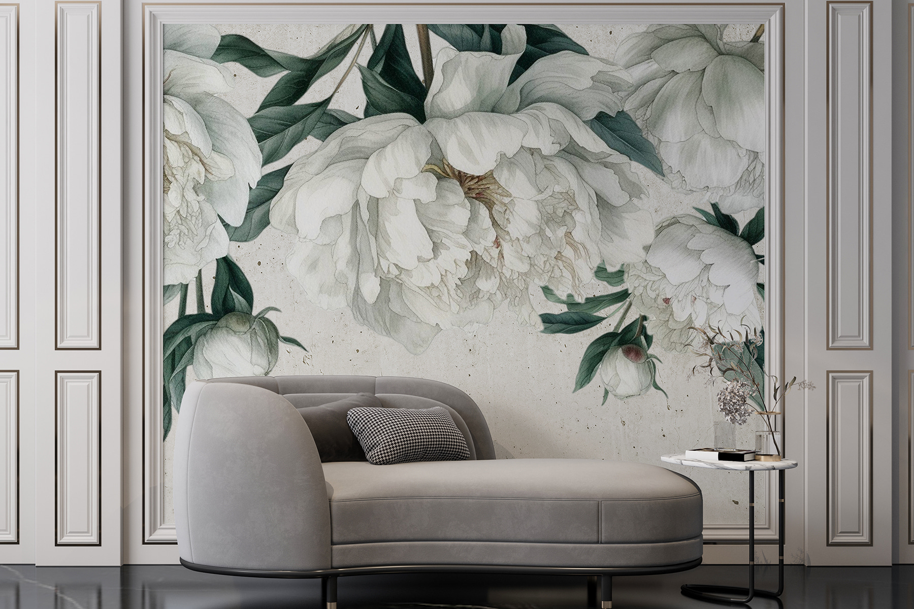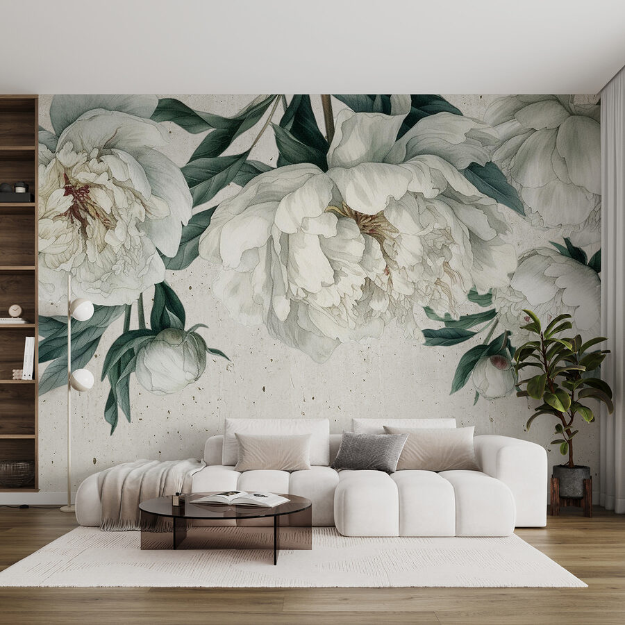Transformeer elke kamer met deze prachtige muurschildering met witte pioenrozen tussen weelderige groene bladeren. Stel je voor dat je de ruimte binnenstapt en het gevoel hebt dat je net een serene tuin bent binnengestapt – wat een heerlijke sfeer! Deze muurschildering is niet zomaar een decorstuk; het vertelt een verhaal van elegantie en rust. De zachte bloemblaadjes fluisteren bijna ontspanning, waardoor het perfect is voor een gezellige leeshoek of een uitnodigende woonkamer.