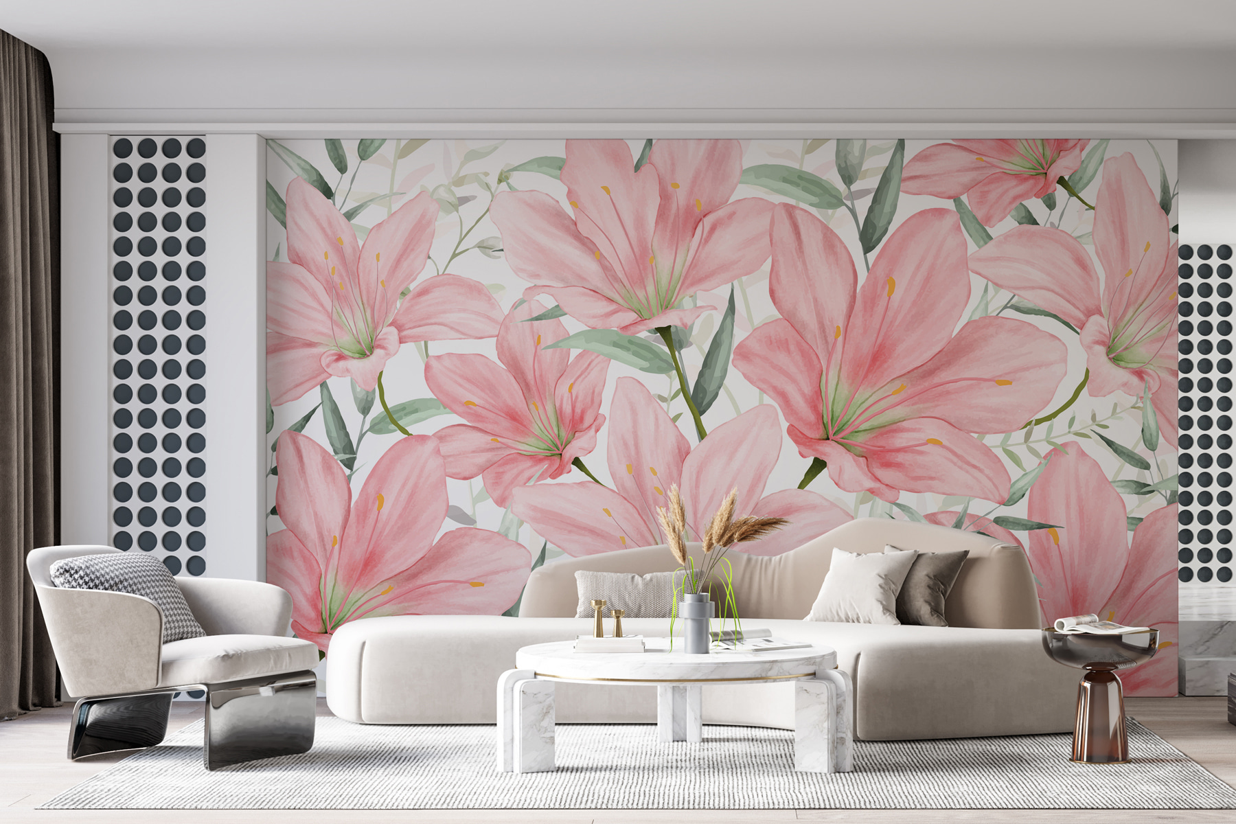 Stel je eens voor dat je een kamer binnenstapt waar elke muur je vriendelijk begroet met bloeiende lelies, zachtroze en elegant in de houding. Deze muurschildering – laten we het de scèneknaller noemen – brengt een beetje natuur naar binnen, met een vleugje sprookjes. Het is alsof je een tuinfeest hebt zonder je zorgen te maken over het weer! Perfect voor wie houdt van een mix van kunst en natuur, het voelt als een persoonlijke knuffel van Moeder Natuur zelf. Gasten vragen misschien wel waar je dat prachtige “kunstwerk” vandaan hebt – en je kunt gewoon glimlachen, wetend knikken en de lelies het woord laten doen.