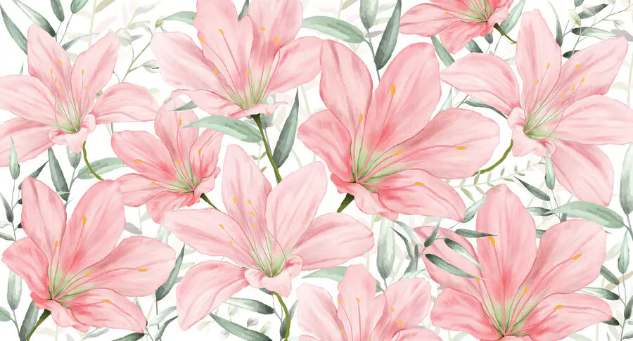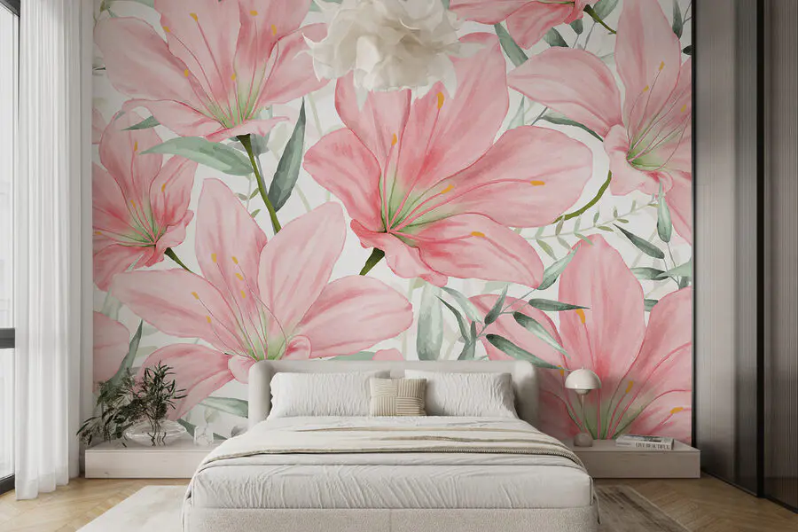 Stel je eens voor dat je een kamer binnenstapt waar elke muur je vriendelijk begroet met bloeiende lelies, zachtroze en elegant in de houding. Deze muurschildering – laten we het de scèneknaller noemen – brengt een beetje natuur naar binnen, met een vleugje sprookjes. Het is alsof je een tuinfeest hebt zonder je zorgen te maken over het weer! Perfect voor wie houdt van een mix van kunst en natuur, het voelt als een persoonlijke knuffel van Moeder Natuur zelf. Gasten vragen misschien wel waar je dat prachtige “kunstwerk” vandaan hebt – en je kunt gewoon glimlachen, wetend knikken en de lelies het woord laten doen.