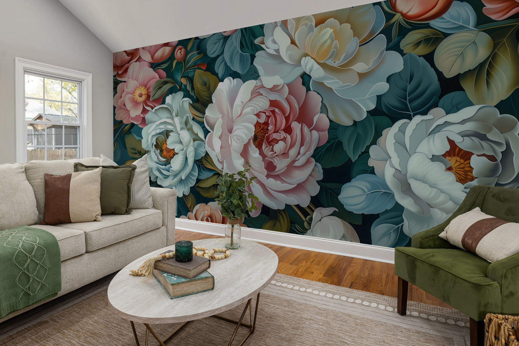 Zo’n muurschildering transformeert elke ruimte. Het kan je persoonlijke ontsnapping zijn en een sombere kamer veranderen in een levendige tuin. Stel je een kopje koffie ‘s ochtends voor met deze bloemen als achtergrond – het is genoeg om elke dag op te fleuren. De mix van diepe, rijke kleuren en ingewikkelde details laat het knallen.