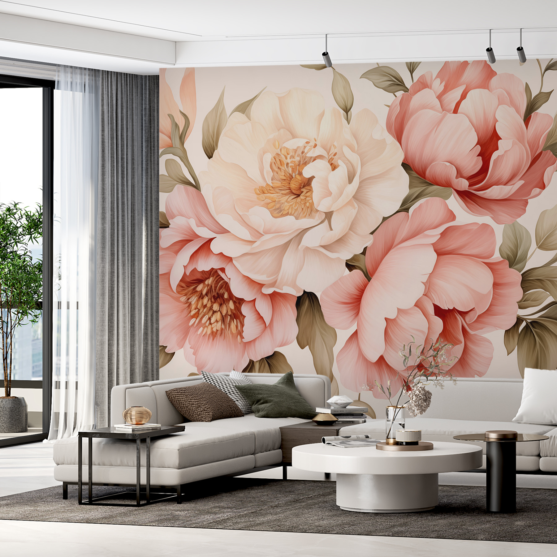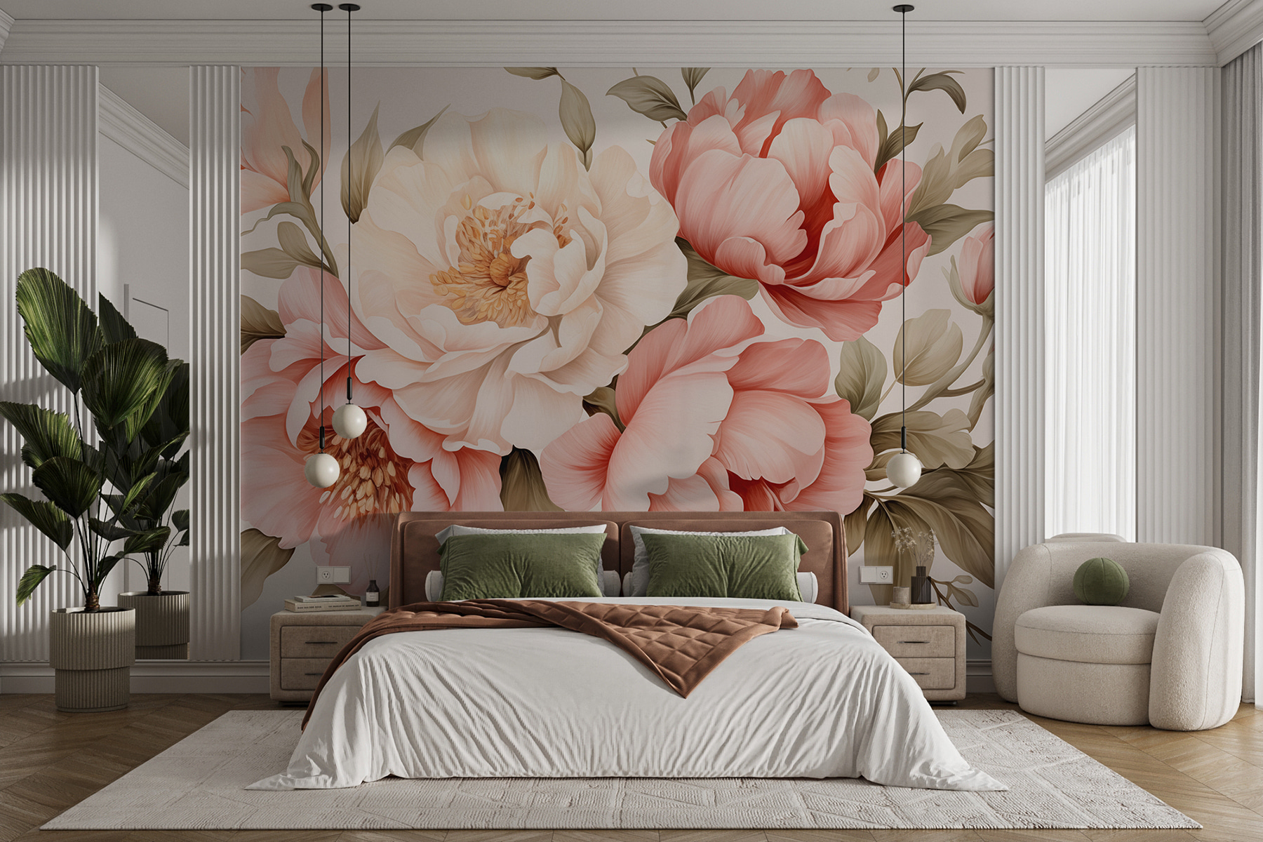 Stel je voor dat je een kamer binnenloopt en het gevoel hebt dat je net een dromerige tuin bent binnengestapt. Dat is de magie van de muurschildering “Zachte bloemen in delicate tinten”. Het is alsof deze pioenrozen geheimen van ontspanning in je kamer fluisteren. Deze bloemen, die perfect zijn voor een serene slaapkamer of een elegante woonkamer, lijken bijna tot leven te komen met hun zachte bloemblaadjes en weelderig groen. En laten we eerlijk zijn, wie houdt er niet van een muur die moeiteloos de ster van de kamer wordt? Het is stijlvol en toch gezellig, en een heerlijke gespreksstarter. Gewoonweg prachtig in bloei!
