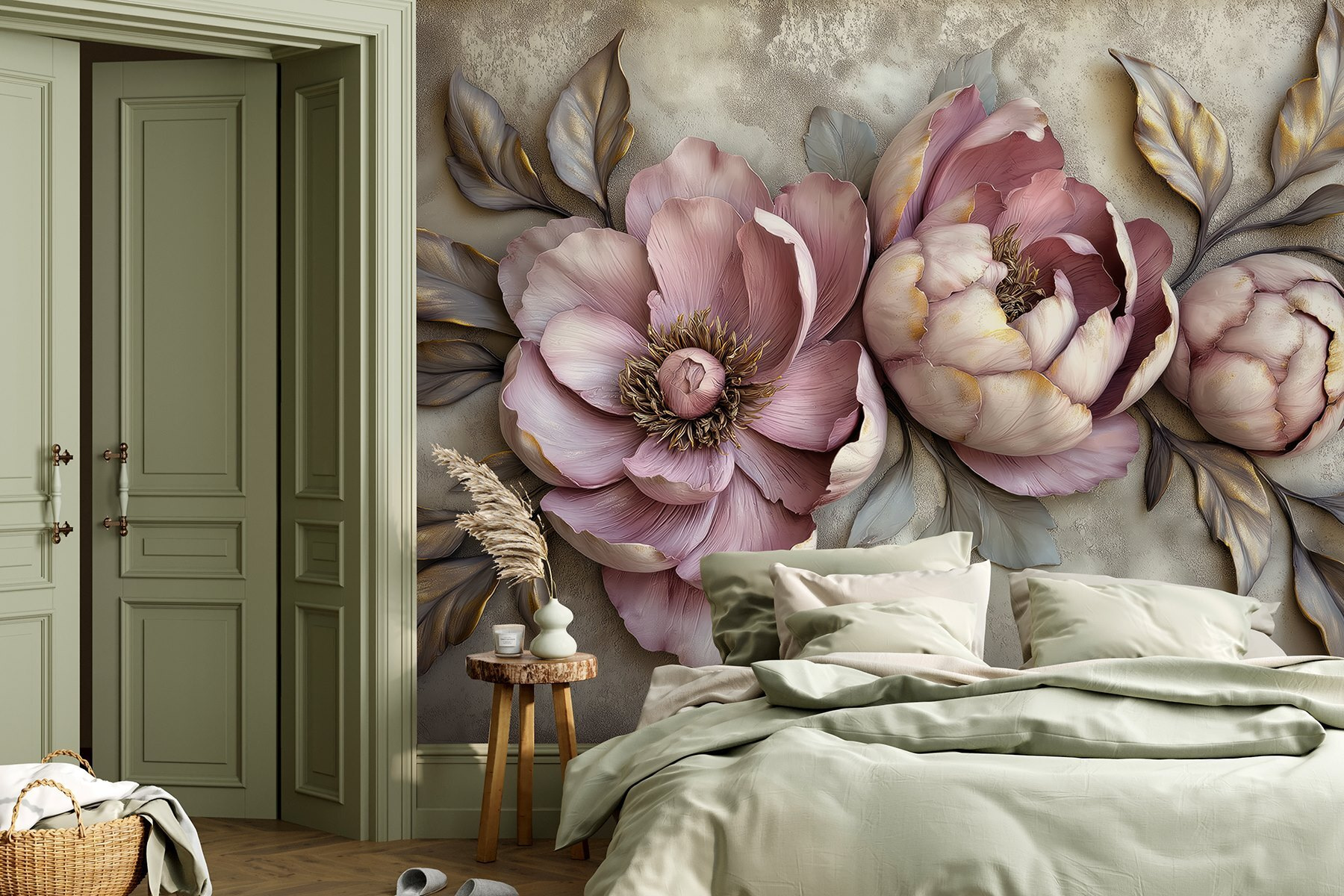 Transformeer elke kamer met deze prachtige muurschildering, met een prachtig tapijt van bloemen en bladeren die bijna van de muur springen. Stel je voor dat je de ruimte binnenstapt en meteen wordt omringd door de warmte en charme van de natuur. De pioenrozen lijken wel klaar om te bloeien in je woonkamer! De zachte pastelkleuren creëren een mooie achtergrond, waardoor het perfect is voor gezellige avonden of heldere, zonnige dagen. Bovendien is het een gespreksstarter – wie zou er niet nieuwsgierig zijn naar die prachtige bloemen? Geef je muren een persoonlijkheid die vreugde en een vleugje elegantie brengt. Perfect voor bloemenliefhebbers!
