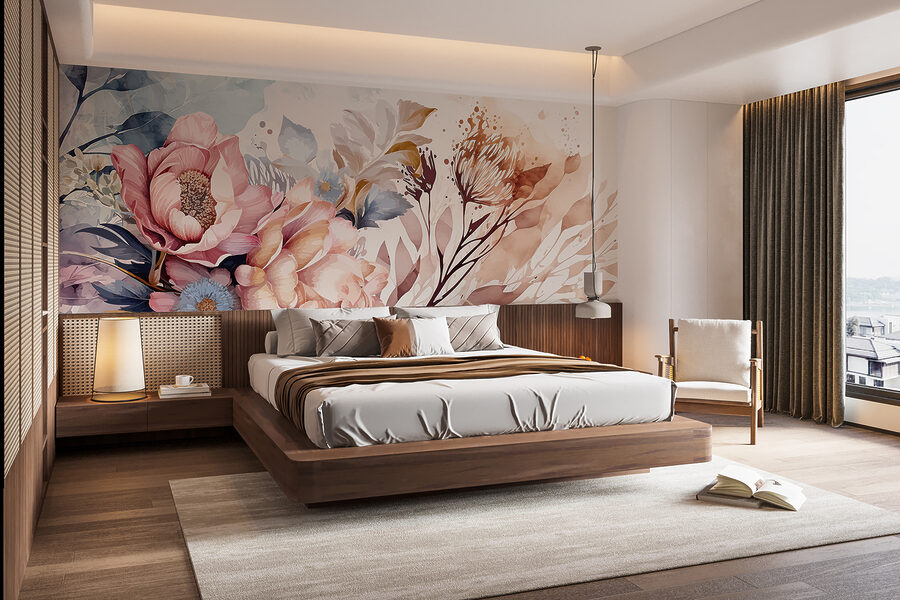 Stel je voor: je loopt een kamer binnen en bam! Deze muurschildering begroet je met weelderige wervelingen van bloemen en bladeren. Het is alsof je een dromerige aquareltuin binnenstapt, maar dan zonder insecten. Perfect om een vleugje natuur toe te voegen zonder het gedoe van planten water geven. Het heeft een knusse uitstraling, alsof je jezelf in een favoriete deken wikkelt terwijl je thee drinkt. Vrienden komen misschien even langs om zich te vergapen aan de artistieke flair. Het is de charme van de natuur, vastgelegd en afgedrukt – klaar om elke muur in een verhaal te veranderen.
