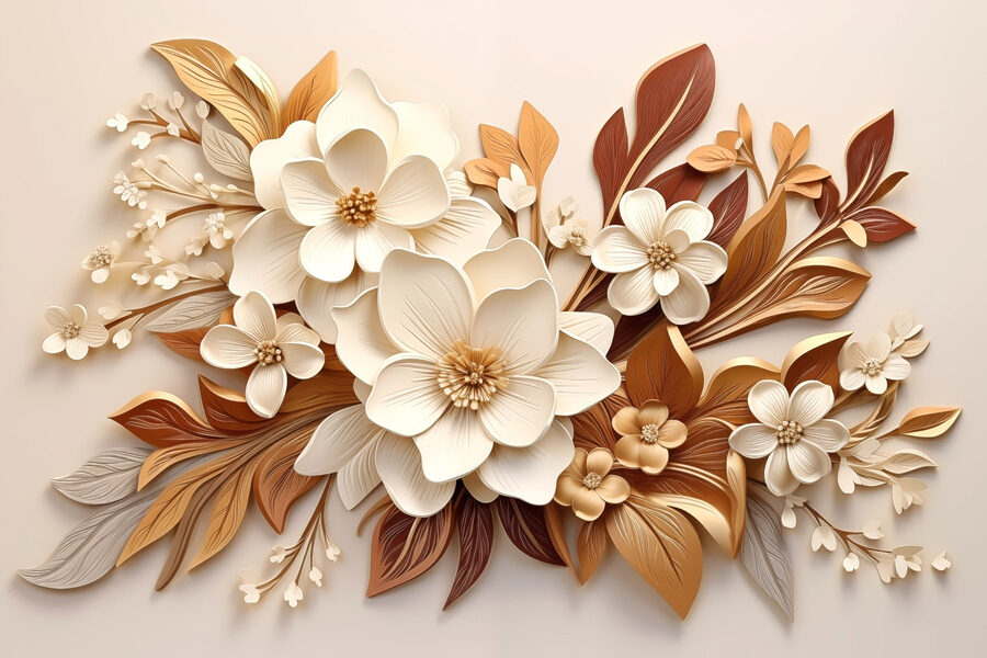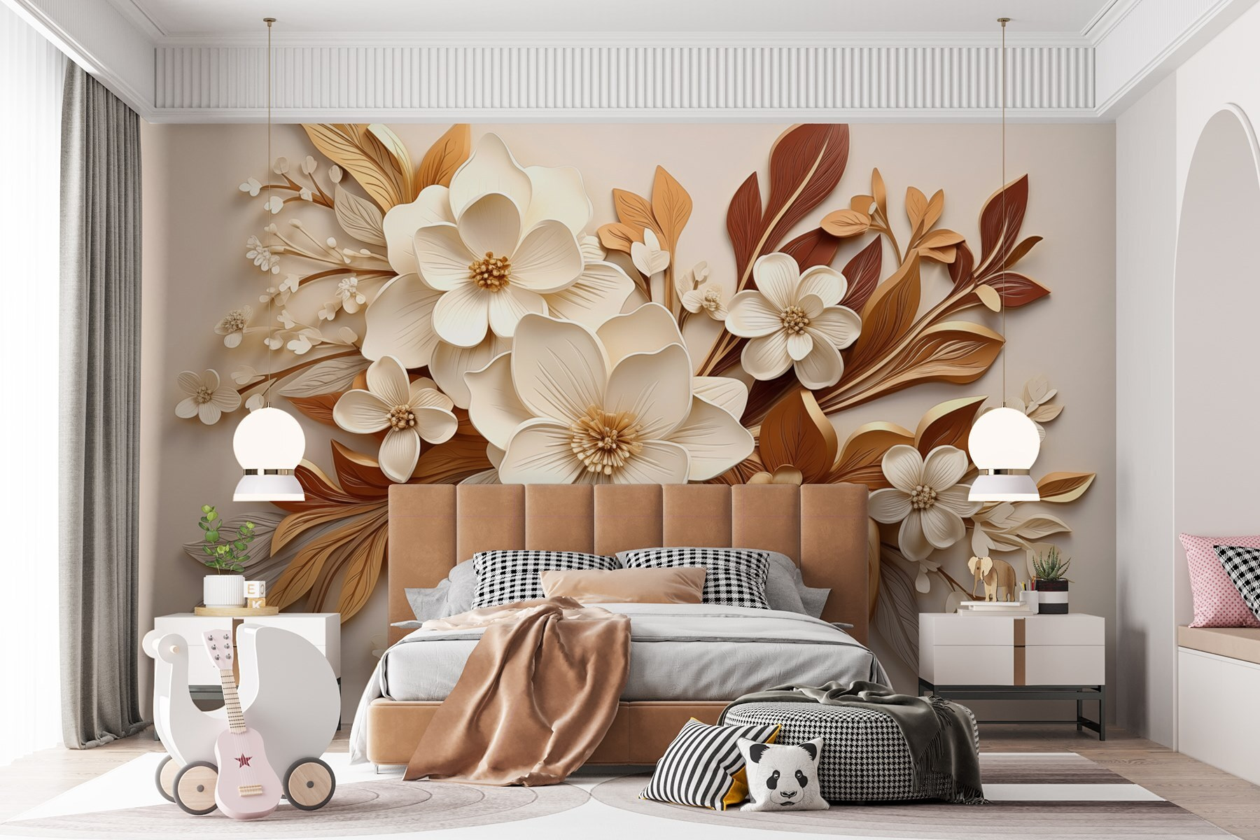 Transformeer elke ruimte met deze charmante muurschildering met een heerlijke mix van witte en bruine bloemen. Stel je voor dat je een kamer binnenloopt die meer weg heeft van een zonovergoten tuin dan van alleen maar muren. Het ontwerp straalt warmte en gezelligheid uit – perfect voor een hoekje waar je lekker kunt wegkruipen met een goed boek of aan je koffie kunt nippen terwijl je wegdroomt. Elk bloemblaadje en blaadje speelt mooi samen en creëert een zacht focuspunt dat uitnodigt tot een gesprek. Echt, zie je het al voor je dat je gasten het bewonderen? Het is alsof je een stukje natuur in huis hebt, zonder de pollen.