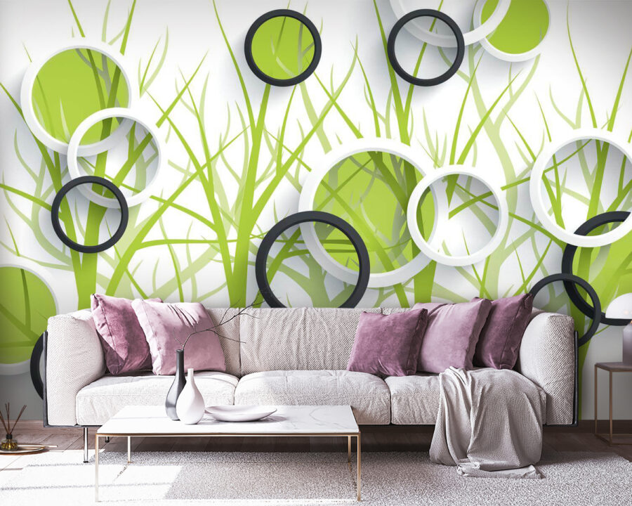 Met dit ‘behang met cirkels en bomen’ kunt u een kamer in een handomdraai omtoveren tot een gezellige oase. Stel u voor dat u een wereld binnenstapt waar geometrische vormen samenkomen met de charme van de natuur. Het levendige groen in combinatie met de strakke lijnen van de cirkels creëert een luchtige sfeer die fris aanvoelt, alsof u op een lentedag een raam opent! U hebt geen hamers of spijkers nodig; dit behang laat zich in een handomdraai aanbrengen. Het is perfect voor speelse kinderkamers, stijlvolle woonkamers of elke ruimte die een snelle opkikker nodig heeft. Stel je voor dat je ‘s ochtends van je koffie nipt terwijl je verdwaalt in die wervelende patronen, of dat je vrienden ontvangt die niet anders kunnen dan je wanddecoratie bewonderen. Het zal gesprekken op gang brengen en misschien een beetje jaloezie – maar dan heel subtiel. Dus maak je klaar om deze eigenzinnige, maar serene decoratie te omarmen, die zonder veel poespas een vleugje natuur in huis brengt.