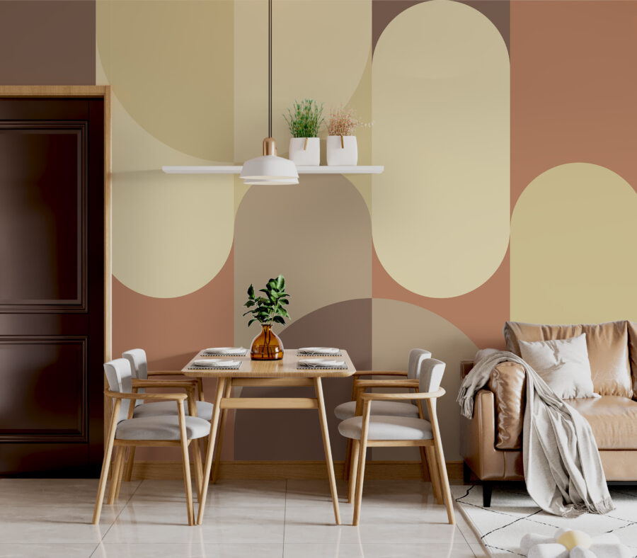 Hallo daar! Wil je je ruimte een beetje opvrolijken? Kijk dan eens naar deze “Geometric Abstract” muurschildering. Serieus, het is net een knusse knuffel uit de jaren ’70, maar dan met een moderne twist. De aardetinten zorgen voor een ongelooflijk warm en uitnodigend gevoel, alsof je op een regenachtige dag een gezellige koffietent binnenstapt. Deze muurschildering heeft van die gladde, ronde vormen die je doen denken aan een retro albumhoes – perfect om een beetje groove toe te voegen aan elke kamer.
