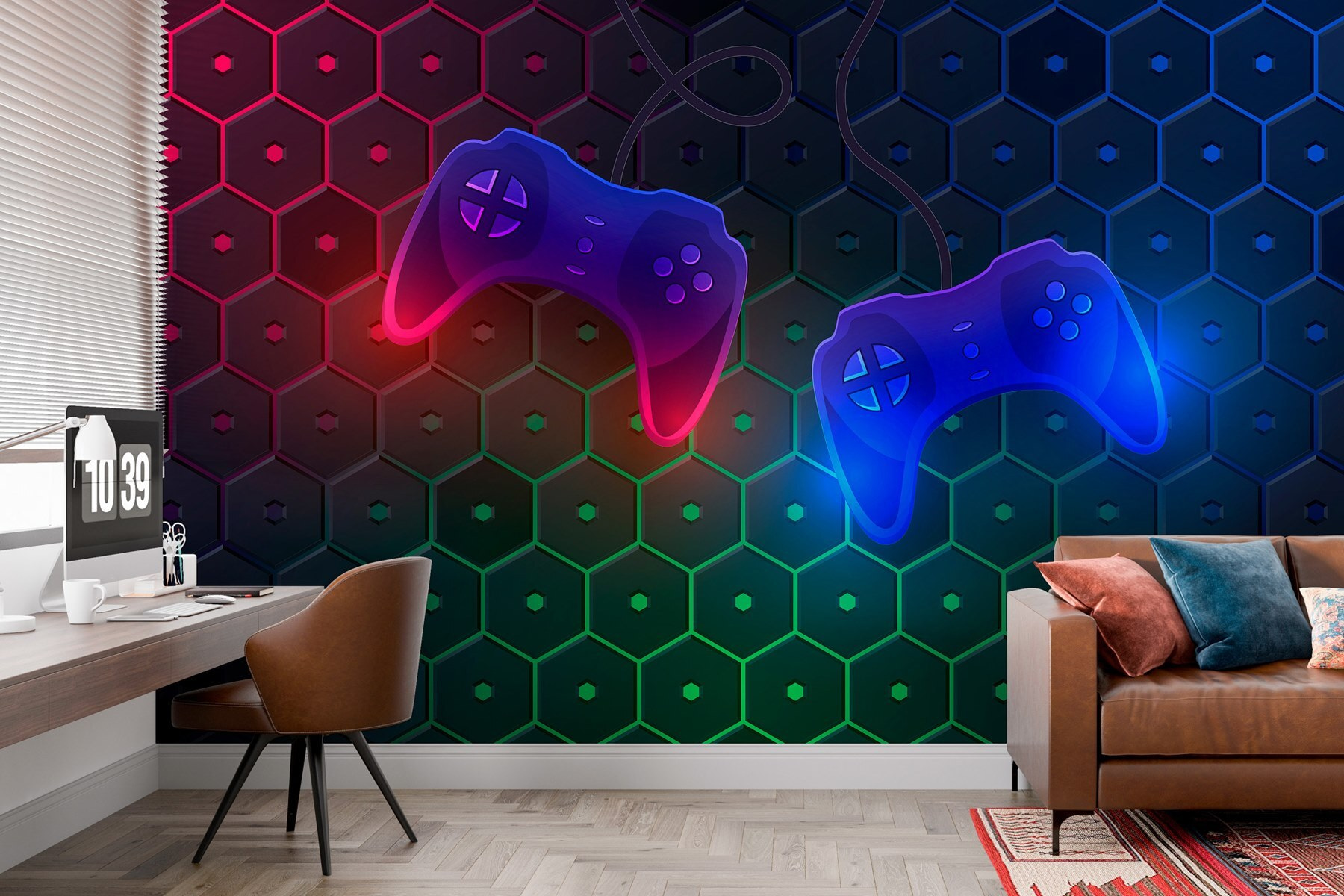 Transformeer je ruimte met een uitbarsting van creativiteit! Deze betoverende muurschildering met levendige gamecontrollers op een zeshoekige achtergrond is als een speelse uitnodiging om je onder te dompelen in de wereld van gaming. Stel je voor dat je samen met vrienden rondhangt, terwijl het gelach weerklinkt terwijl je elkaar uitdaagt, allemaal onder de gloed van die kleurrijke controllers. Het is niet alleen decor; het is een vibe – een leuke gespreksstarter die energie brengt in elke kamer. De mix van felle kleuren en geometrische patronen voegt een moderne twist toe die alles fris houdt. Perfect voor grotten voor gamers, kinderkamers of elke andere ruimte die een vleugje persoonlijkheid nodig heeft. Telkens als je langsloopt, zul je glimlachen. Het is net alsof de muurschildering je uitdaagt voor een rematch!