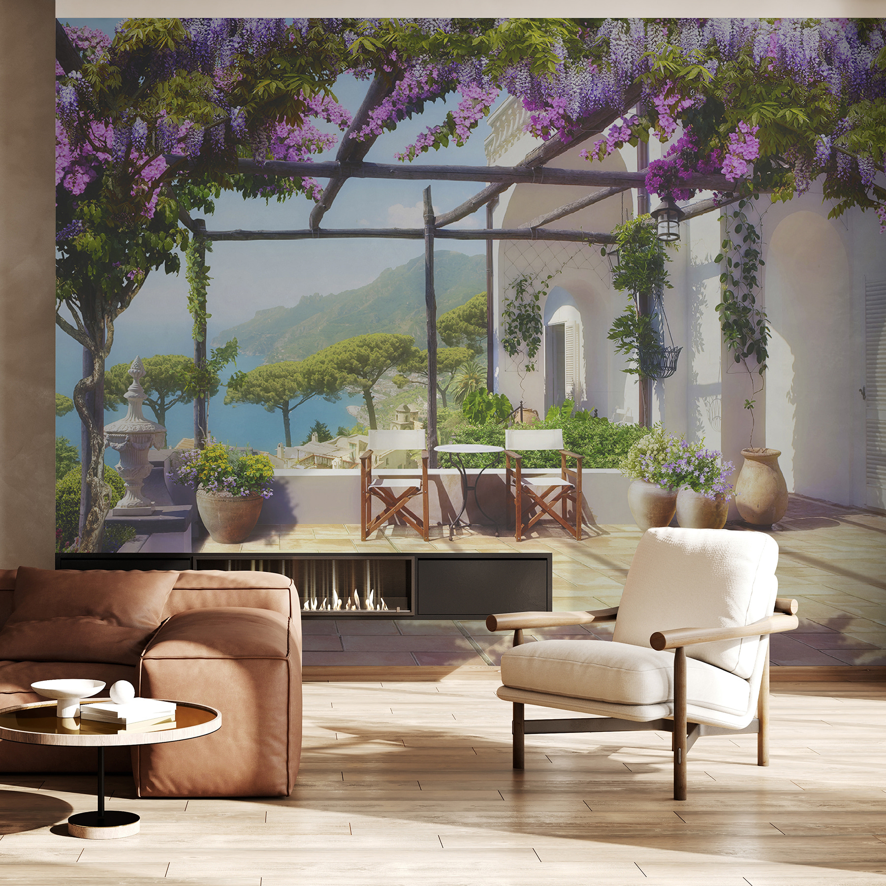 Deze muurschildering is perfect om elke ruimte op te fleuren en combineert klassieke architectuur met de schoonheid van de natuur. Je hoort bijna het zachte geritsel van de bladeren en voelt een warme bries. Of het nu de woonkamer is of een gezellig caféhoekje, deze muurschildering brengt een uitnodigende, serene sfeer… bijna alsof je bent meegenomen naar je favoriete kustplaats. Die terracotta potten vol kleurrijke bloemen voegen dat perfecte vleugje charme toe.