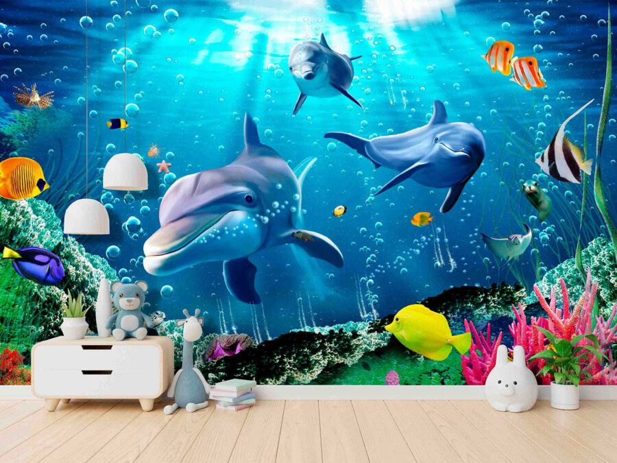 Stel je voor dat je in een levendige onderwaterwereld duikt zonder je kamer te verlaten – klinkt geweldig, toch? Deze muurschildering “Dolfijn zwemt in water” is als een uitbarsting van magie voor je muren. Dolfijnen, kleurrijke vissen, koraal – het is net een klein avontuur in je eigen leefruimte! Perfect voor kinderkamers of iedereen die jong van hart is, het brengt een vleugje vreugde en verwondering. Het 3D-effect geeft je het gevoel dat je bijna natte voeten krijgt… en eerlijk, wie zou er niet elke dag met dolfijnen willen zwemmen? Duik erin en laat je fantasie de vrije loop!