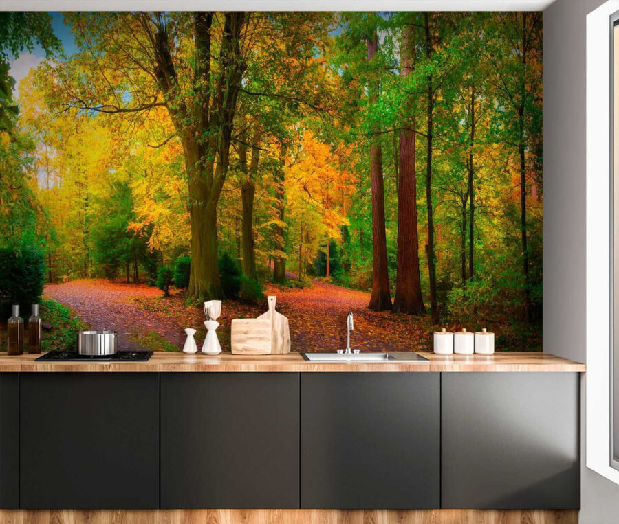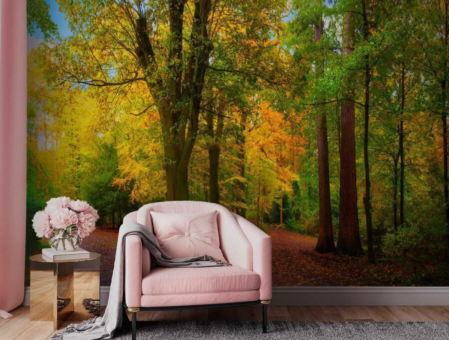 Transformeer elke ruimte met deze prachtige muurschildering van een kleurrijk herfstbos. Stel je kronkelende paden voor omringd door levendige bomen, hun bladeren geschilderd in rijke tinten die de essentie van de herfst vastleggen. Het is alsof je een stukje natuur in huis haalt, waar de zachte omhelzing van een boswandeling kan sudderen op de achtergrond van het dagelijks leven. Stel je voor dat je koffie drinkt terwijl je naar dit tafereel staart of dat je je gedachten over deze vredige paden laat dwalen. Perfect om warmte en sereniteit toe te voegen aan je huis, het zal gesprekken aanwakkeren en een vleugje wildernis direct aan je muren brengen. Natuurliefhebbers, verheug je!
