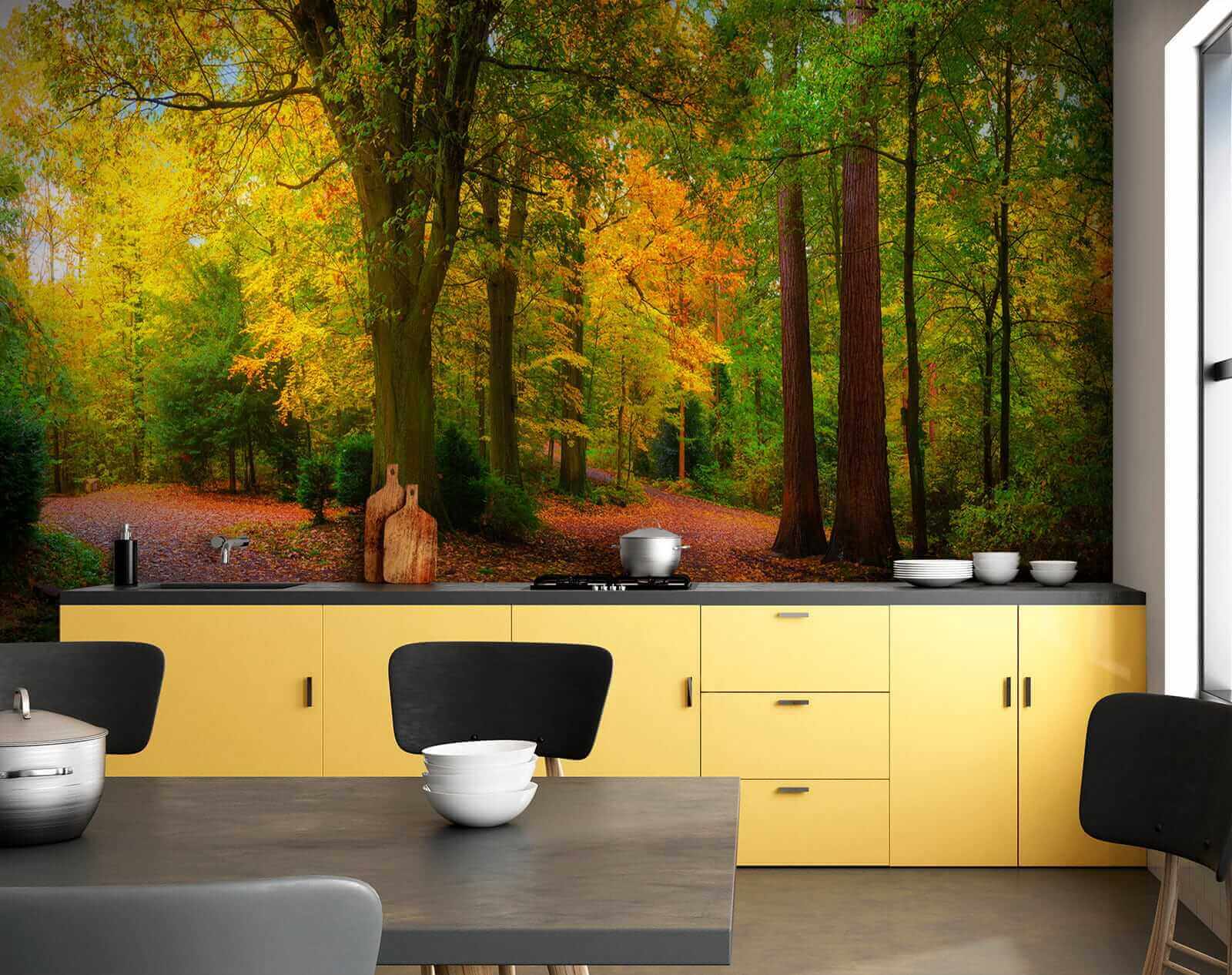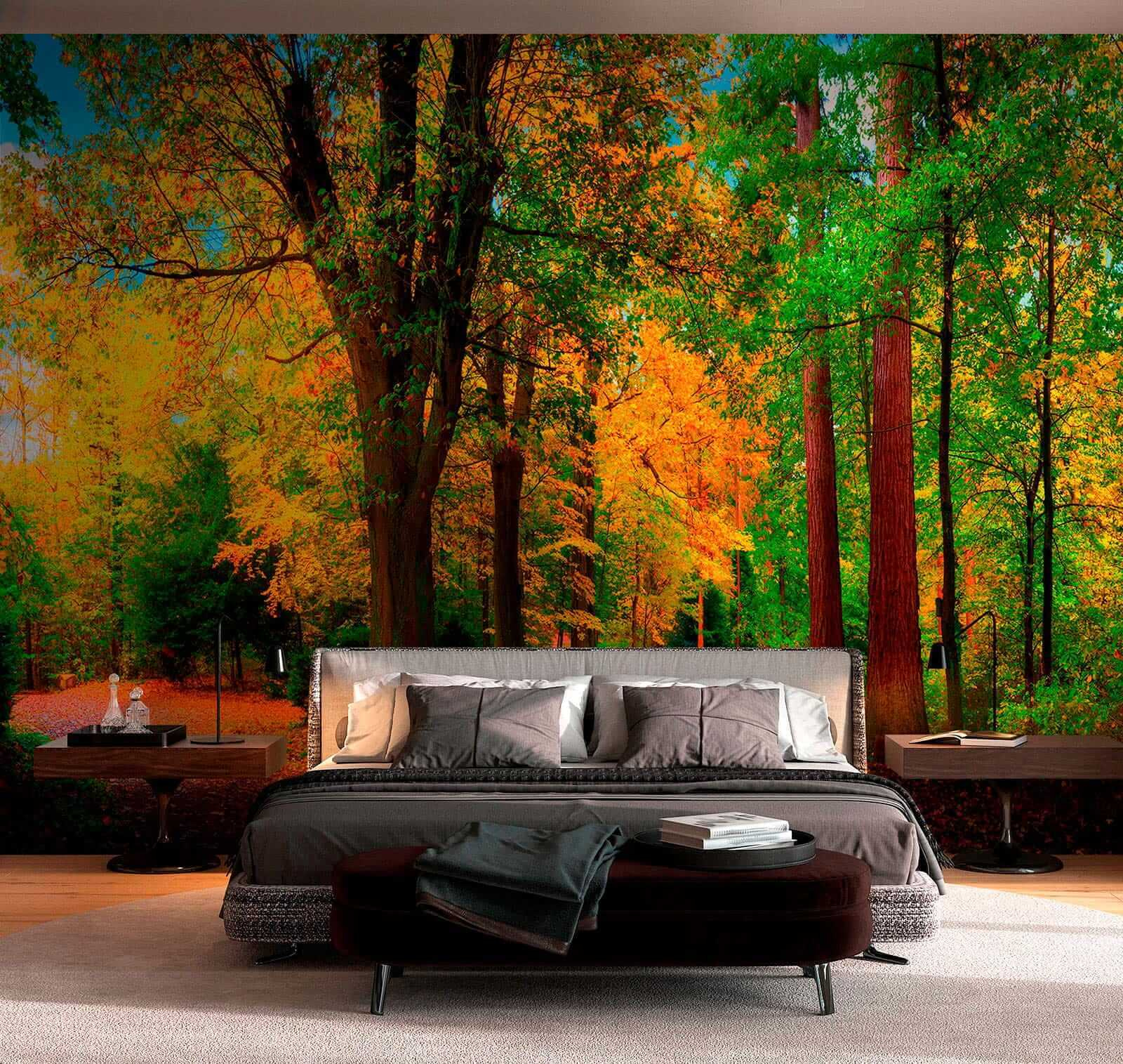 Transformeer elke ruimte met deze prachtige muurschildering van een kleurrijk herfstbos. Stel je kronkelende paden voor omringd door levendige bomen, hun bladeren geschilderd in rijke tinten die de essentie van de herfst vastleggen. Het is alsof je een stukje natuur in huis haalt, waar de zachte omhelzing van een boswandeling kan sudderen op de achtergrond van het dagelijks leven. Stel je voor dat je koffie drinkt terwijl je naar dit tafereel staart of dat je je gedachten over deze vredige paden laat dwalen. Perfect om warmte en sereniteit toe te voegen aan je huis, het zal gesprekken aanwakkeren en een vleugje wildernis direct aan je muren brengen. Natuurliefhebbers, verheug je!