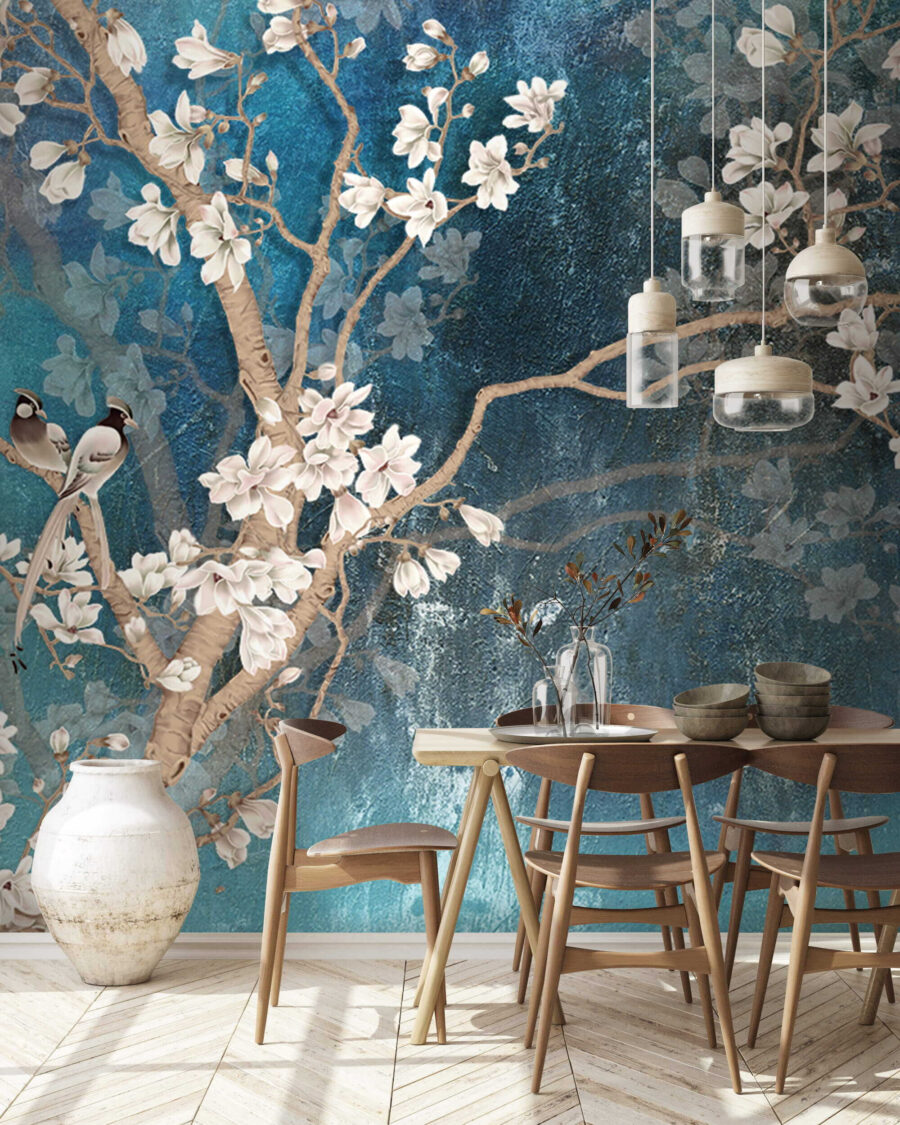 Ooit gedroomd van een vleugje natuurschoon in je interieur? Deze muurschildering “Witte bloem op blauwe achtergrond” is als een frisse wind voor je interieur! Stel je eens voor: delicate witte bloesems op een dromerige blauwe achtergrond, met charmante vogeltjes die sierlijk neerstrijken. Het is net alsof je je eigen geheime tuin hebt, zonder het water geven!