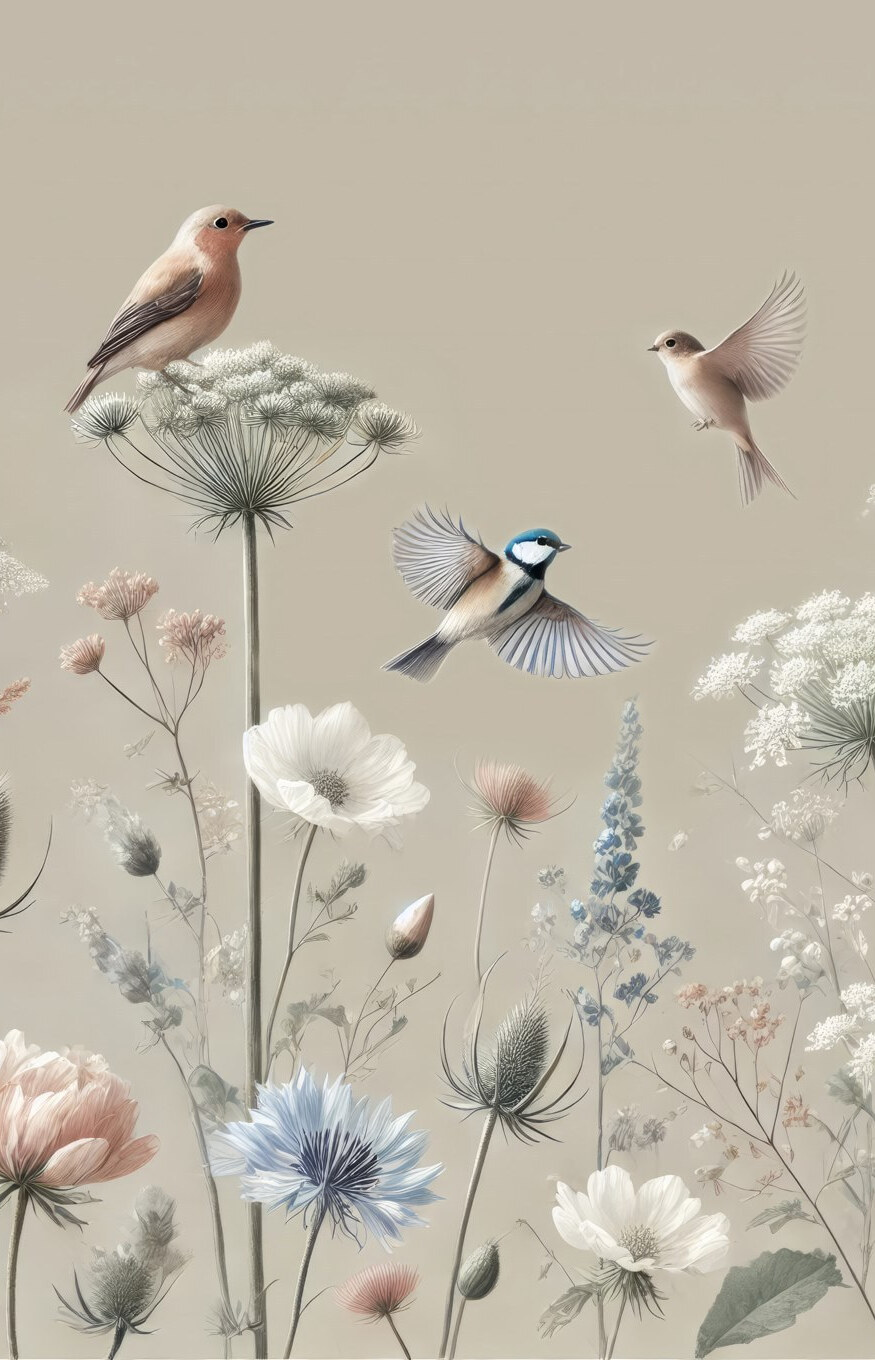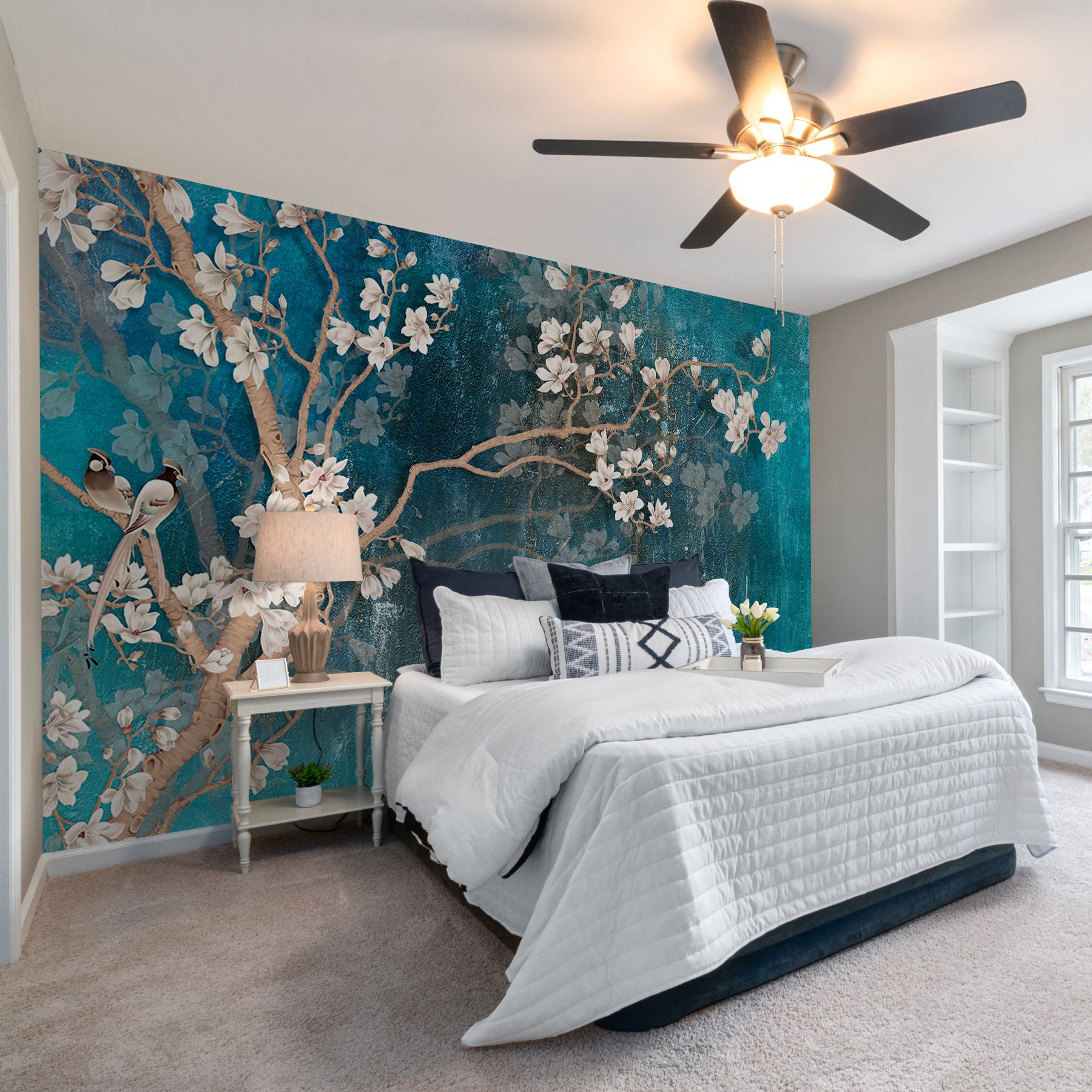 Ooit gedroomd van een vleugje natuurschoon in je interieur? Deze muurschildering “Witte bloem op blauwe achtergrond” is als een frisse wind voor je interieur! Stel je eens voor: delicate witte bloesems op een dromerige blauwe achtergrond, met charmante vogeltjes die sierlijk neerstrijken. Het is net alsof je je eigen geheime tuin hebt, zonder het water geven!