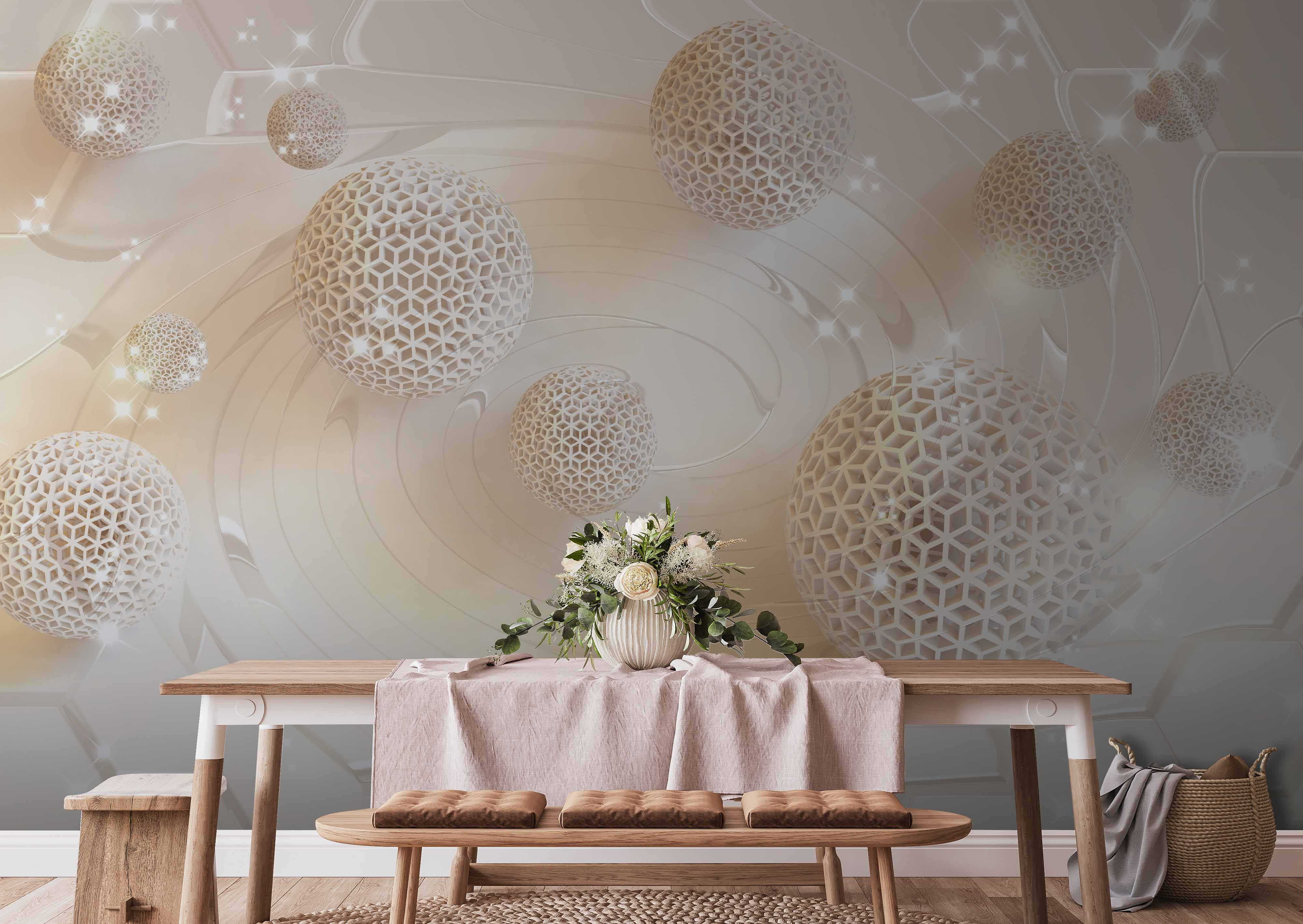 Stel je voor dat je een kamer binnenloopt en het gevoel hebt dat je net een dromerig, sprankelend wonderland bent binnengestapt. Dat is precies wat “Fotobehang Abstract Spheres with Sparkling Design” doet – het verandert elke ruimte in iets buitengewoons. De mix van geometrische patronen en 3D bollen – ze lijken bijna te zweven! – gecombineerd met een subtiele schittering, voegt een magische laag toe die de aandacht trekt.