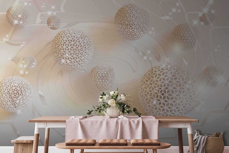 Stel je voor dat je een kamer binnenloopt en het gevoel hebt dat je net een dromerig, sprankelend wonderland bent binnengestapt. Dat is precies wat “Fotobehang Abstract Spheres with Sparkling Design” doet – het verandert elke ruimte in iets buitengewoons. De mix van geometrische patronen en 3D bollen – ze lijken bijna te zweven! – gecombineerd met een subtiele schittering, voegt een magische laag toe die de aandacht trekt.