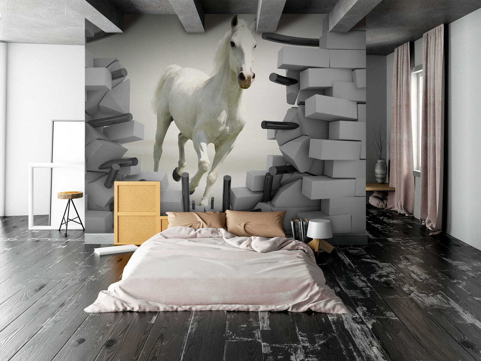 Stel je voor dat je het gevoel hebt dat een witte hengst letterlijk je kamer binnen galoppeert – dwars door de muur heen! Dat is wat je krijgt met deze prachtige muurschildering. De muurschildering heeft een ongelooflijk 3D-effect waardoor het lijkt alsof het paard uit het kunstwerk springt en je kamer binnenkomt. Kinderen zullen versteld staan en denken dat ze deel uitmaken van een magisch avontuur. En voor volwassenen is het zeker een gespreksstarter! Of het nu voor een speelkamer, een funky woonkamer of zelfs een creatieve kantoorruimte is, deze muurschildering geeft een uitbarsting van energie en een vleugje eigenzinnigheid. Het is betoverend, gedurfd en precies de juiste hoeveelheid onverwacht-je kunt er gewoon niet naar kijken zonder te glimlachen!