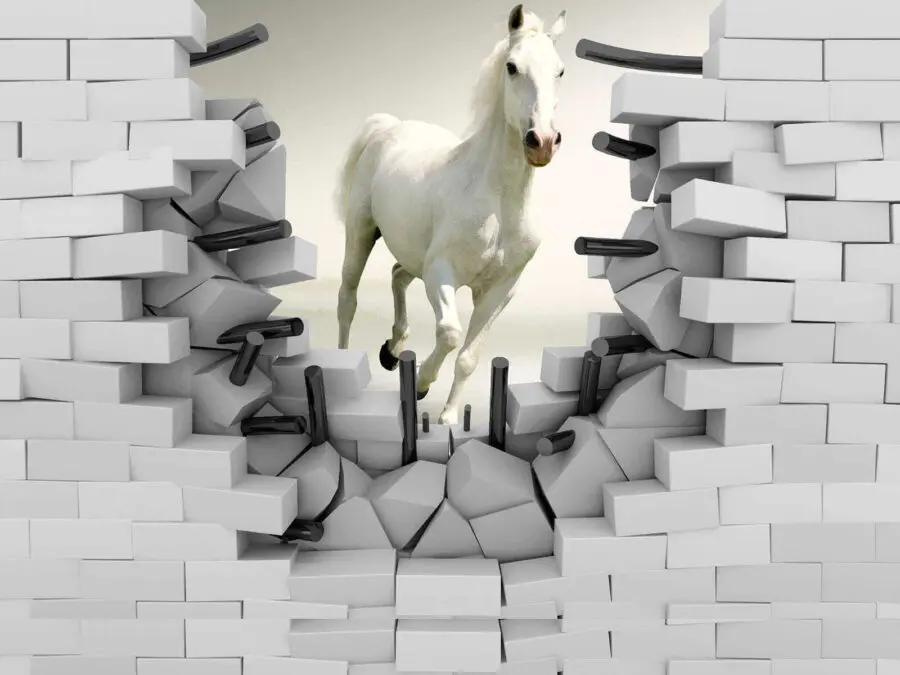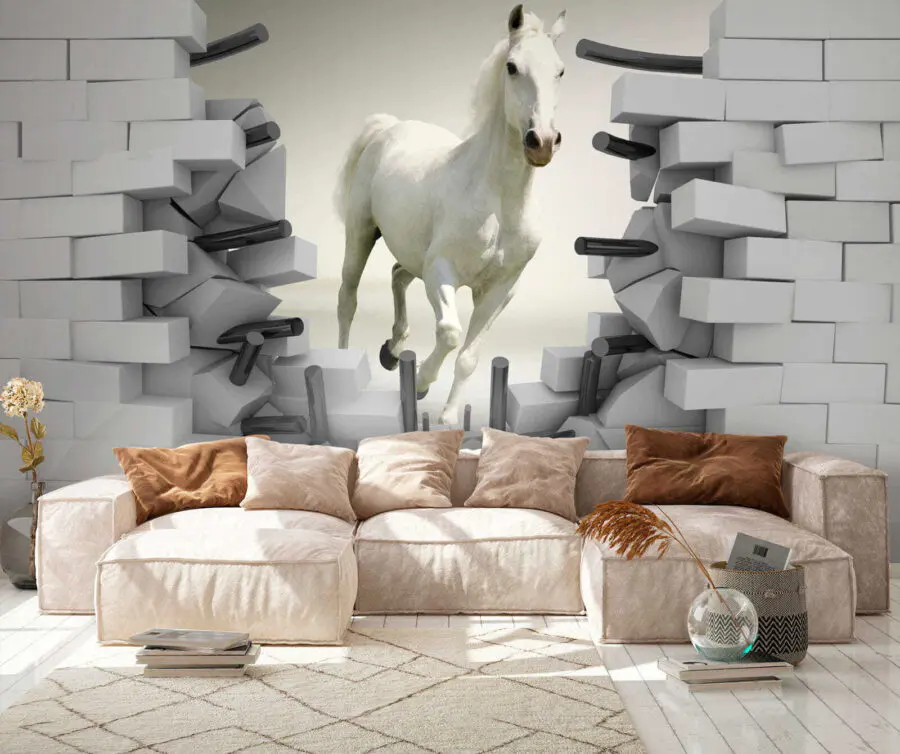 Stel je voor dat je het gevoel hebt dat een witte hengst letterlijk je kamer binnen galoppeert – dwars door de muur heen! Dat is wat je krijgt met deze prachtige muurschildering. De muurschildering heeft een ongelooflijk 3D-effect waardoor het lijkt alsof het paard uit het kunstwerk springt en je kamer binnenkomt. Kinderen zullen versteld staan en denken dat ze deel uitmaken van een magisch avontuur. En voor volwassenen is het zeker een gespreksstarter! Of het nu voor een speelkamer, een funky woonkamer of zelfs een creatieve kantoorruimte is, deze muurschildering geeft een uitbarsting van energie en een vleugje eigenzinnigheid. Het is betoverend, gedurfd en precies de juiste hoeveelheid onverwacht-je kunt er gewoon niet naar kijken zonder te glimlachen!