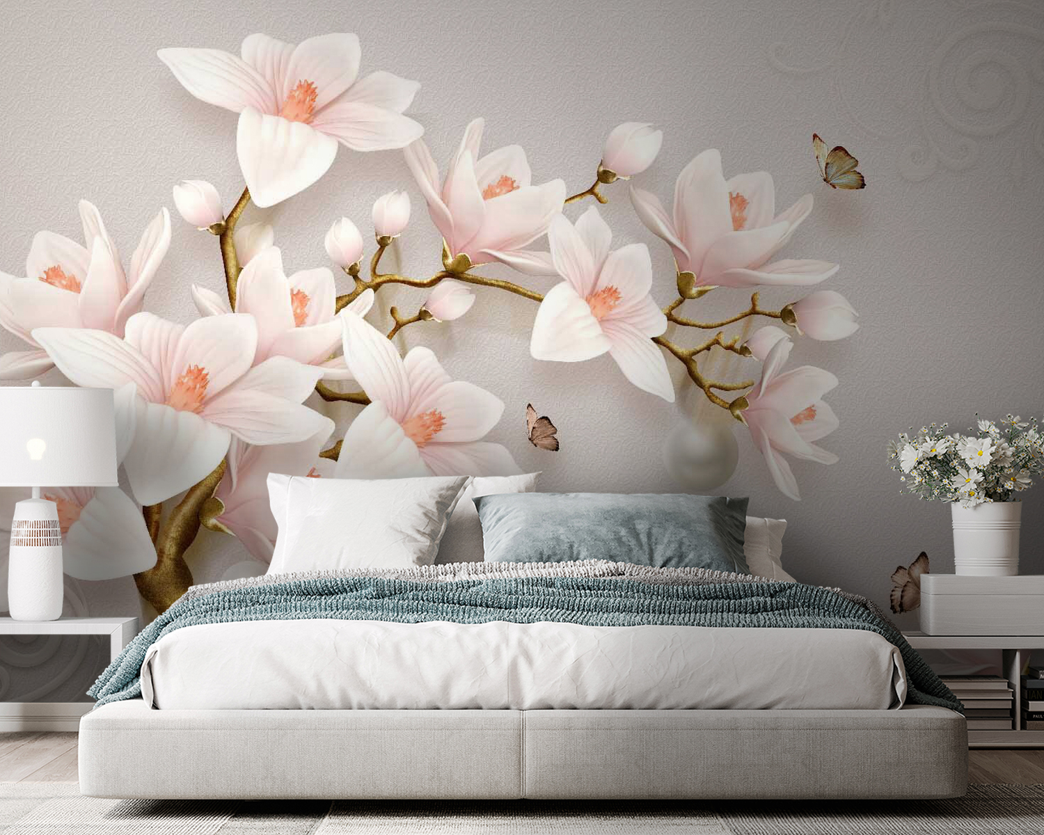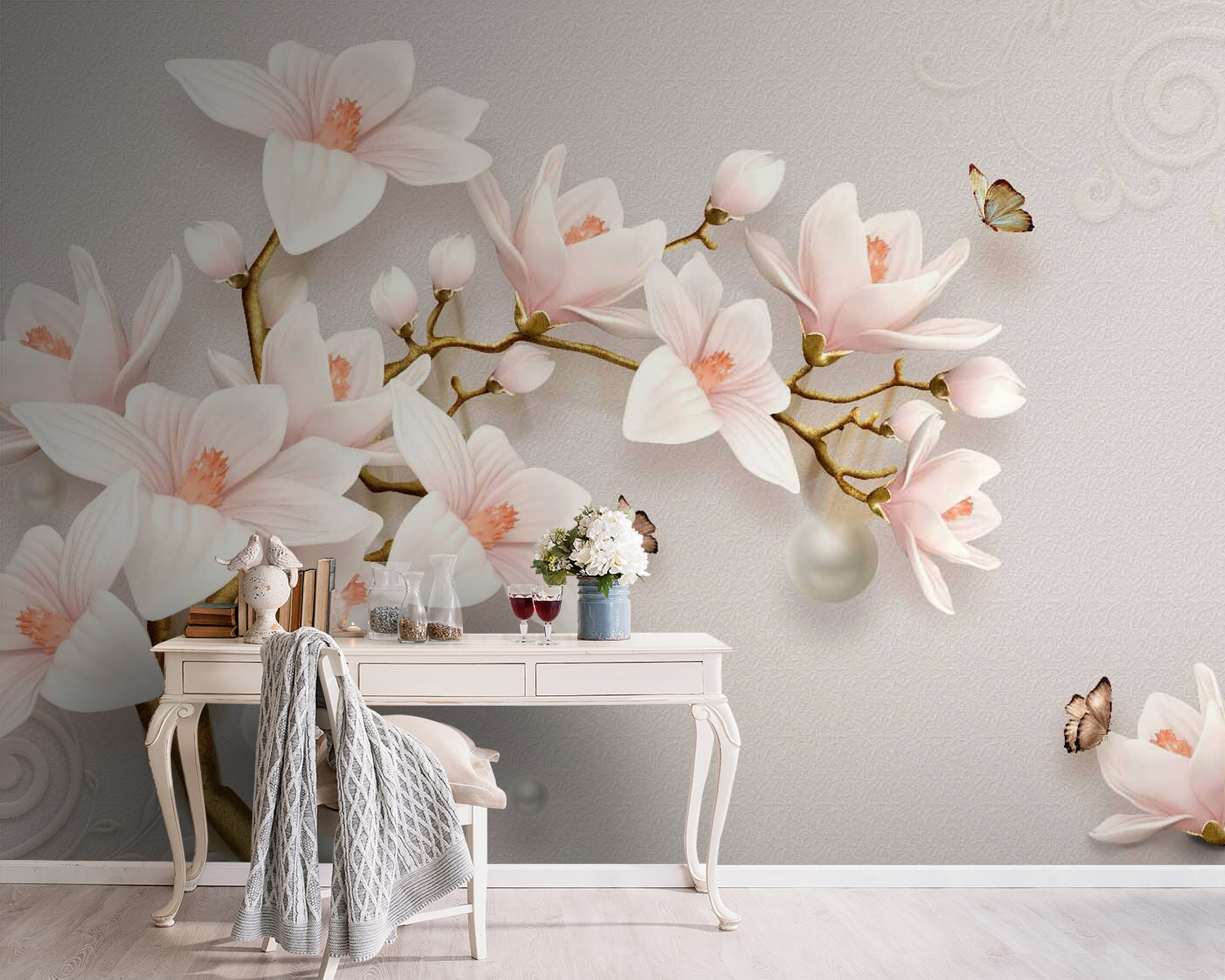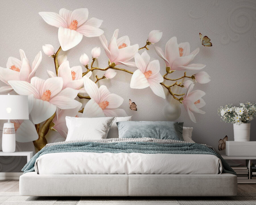 Transformeer uw ruimte met deze betoverende muurschilderingen met delicate bloesems in zachte tinten. Stel u voor dat u een kamer binnenstapt waar bloemen en zachte kleuren een sfeer creëren die net zo rustgevend is als een warm kopje thee. Perfect voor gezellige avonden of zelfs een spontaan dansfeestje in uw woonkamer – wie houdt er nou niet van een dansje? De mooie details van de bloemen zweven gracieus rond en nodigen bijna vlinders uit om mee te doen. Deze muurschildering is niet alleen decoratief, maar vertelt ook een verhaal, omhult je met rust en laat je muren tot leven komen. Perfect voor iedereen die een beetje natuur in huis wil, of gewoon een vleugje schoonheid.