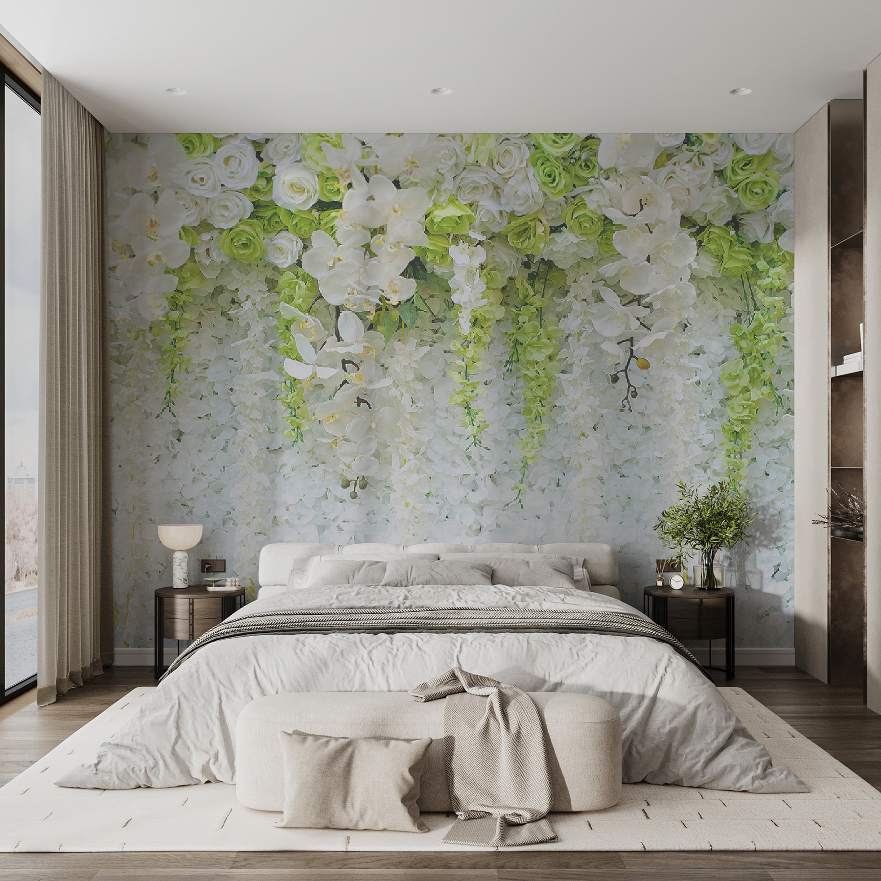 Stel je voor dat je een kamer binnenloopt en begroet wordt door een prachtige waterval van witte en groene bloemen die je muur sieren. Deze muurschildering “Groep witte en groene bloemen” is alsof je een serene tuin binnenstapt zonder je huis te verlaten. Het detail is indrukwekkend – het voelt bijna alsof je de bloemblaadjes kunt aanraken. Het is perfect om een zachte, natuurlijke toets toe te voegen aan elke kamer.