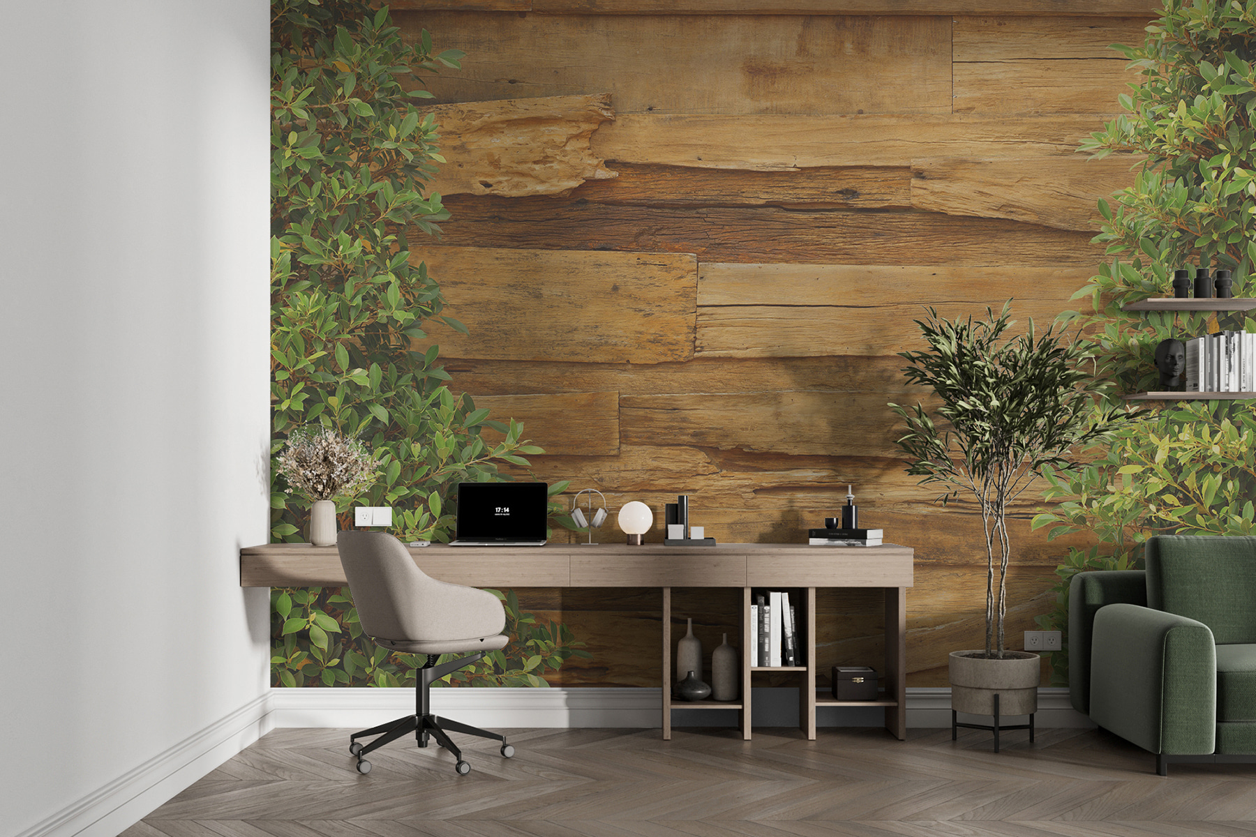 Stel je voor dat je de charme van een rustieke, verweerde houten muur in huis haalt – met een twist. Met deze muurschildering “Verweerde houten muur met groen” waan je je in een gezellige sfeer in een hut, gewoon in je woonkamer! Het hout ziet er oud uit op de beste manier, vol karakter en geschiedenis, en die groene bladeren? Ze geven het een levendig gevoel, alsof de natuur je ruimte binnenglipt.