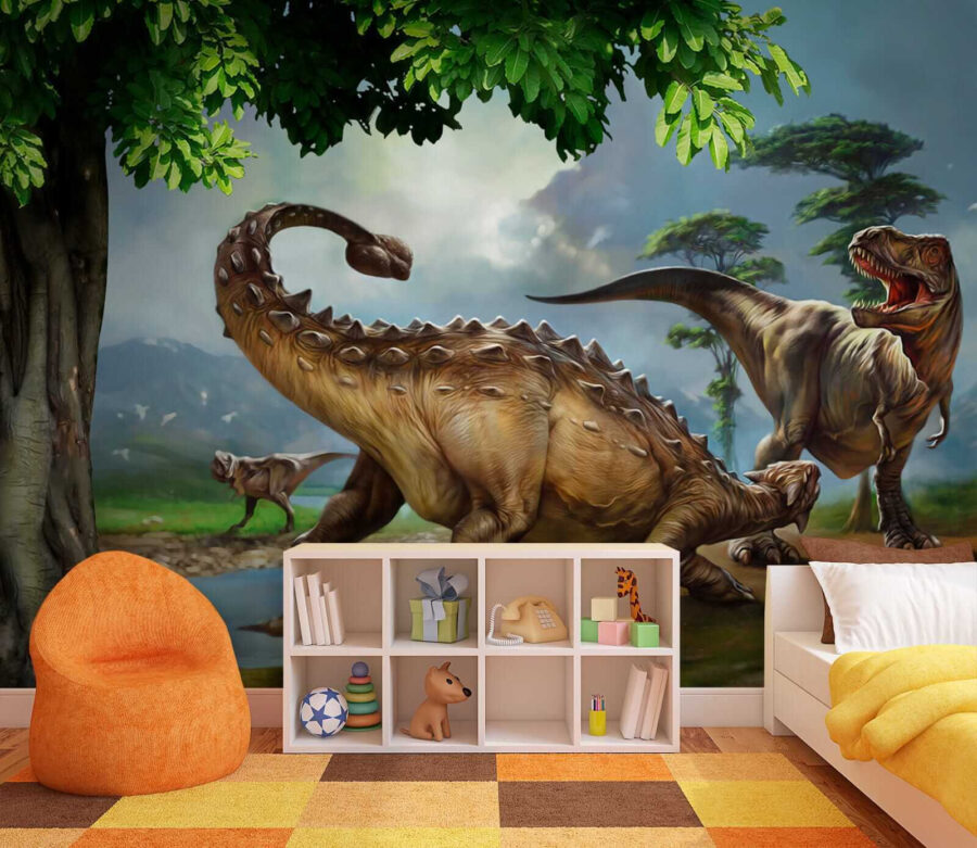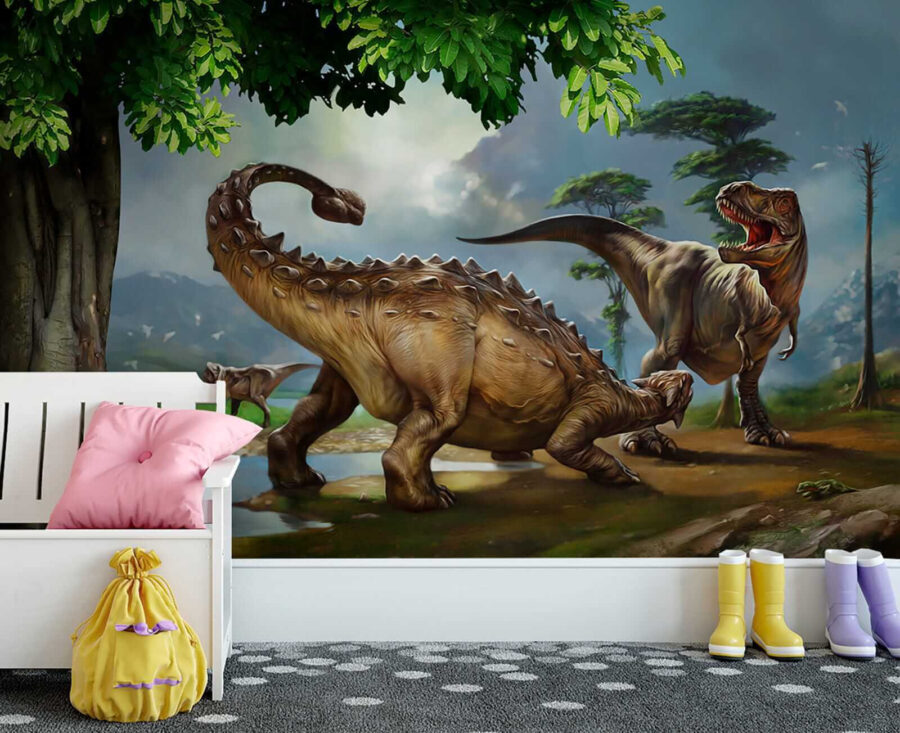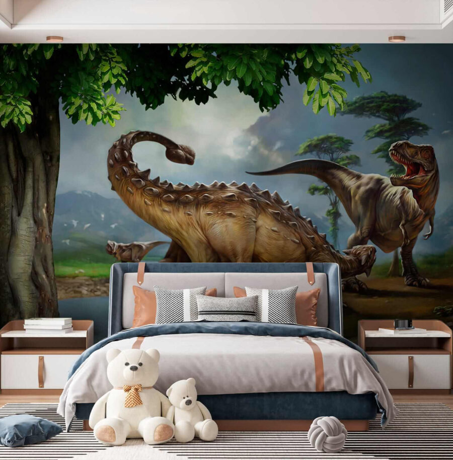 Stel je voor dat je in een scène van een blockbuster dino-film stapt – deze muurschildering is precies dat! Met een levensechte dinosaurus met lange horens en een staart die over de hele muur lijkt te zweven. Kinderen zijn er helemaal weg van, want laten we eerlijk zijn, dinosaurussen zijn gewoon cool. En het is niet alleen voor kinderen. Iedereen die houdt van een vleugje prehistorisch avontuur in zijn interieur zal deze muurschildering een daverend succes vinden. Het is net alsof je je eigen Jurassic oase thuis hebt – zonder de rommelende voetstappen… pfoe! Perfect voor slaapkamers, speelkamers en zelfs eigenzinnige woonkamers. Met levendige kleuren en ongelofelijke details lijkt het net of je teruggaat naar het Krijt. Iemand zin in tijdreizen? Maak van je ruimte een conversatiestarter en laat die oeroude landschappen en wezens elke dag weer tot verbeelding spreken en je verwonderen.