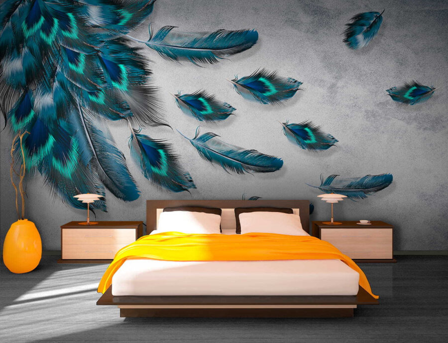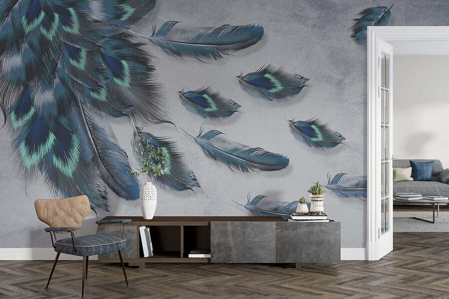 Fotobehang Blauwe veren verspreid op gestructureerde achtergrond. (SKU: u29836)