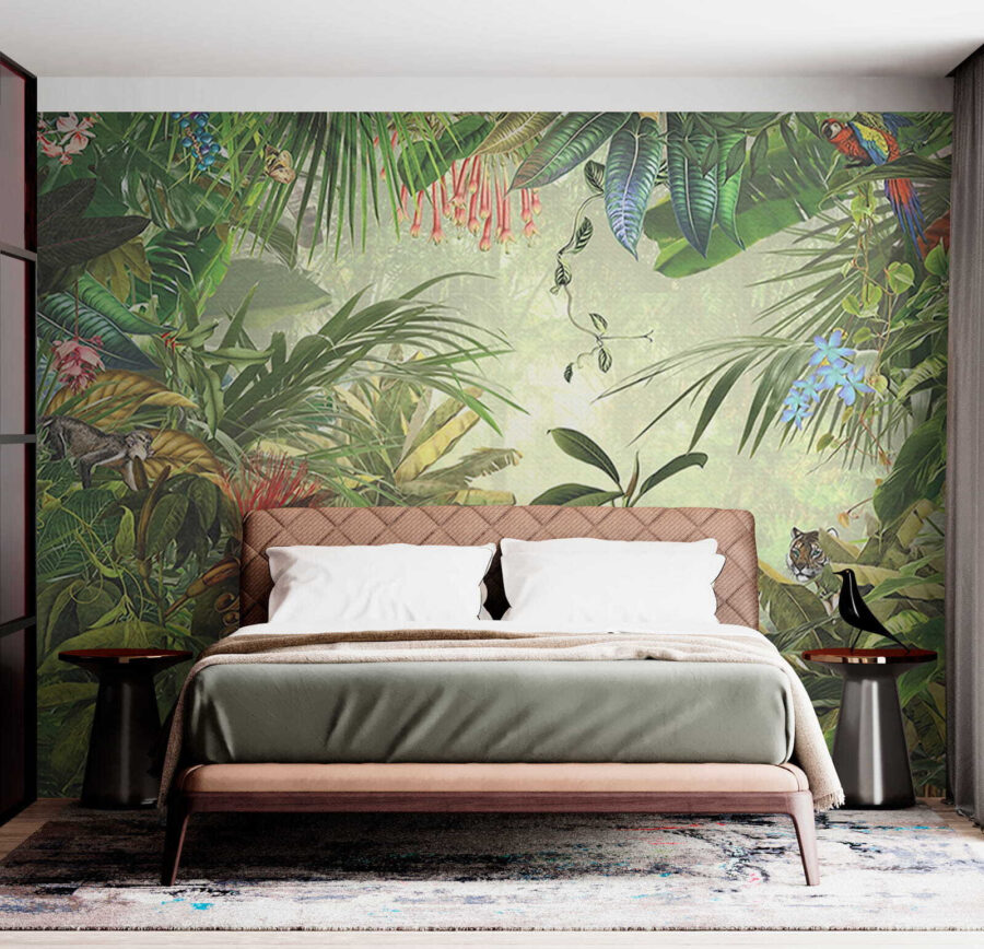 Wil je dat je leefruimte aanvoelt als een exotisch avontuur? Dan is deze “Lush Jungle” muurschildering misschien precies wat je nodig hebt. Stel je voor dat je wakker wordt, je koffie pakt en recht in een levendig regenwoud kijkt dat barst van het leven – papegaaien, apen, tijgers… Je zou bijna het ruisen van de bladeren kunnen horen of een koel junglebriesje kunnen voelen! De kleuren zijn gewoon prachtig diep – weelderig groen, rijke aardetinten, knallen van bloemen. Perfect voor natuurliefhebbers of iedereen die hunkert naar een vleugje wildernis in huis. Het is als een kleine ontsnapping, direct aan je muur!