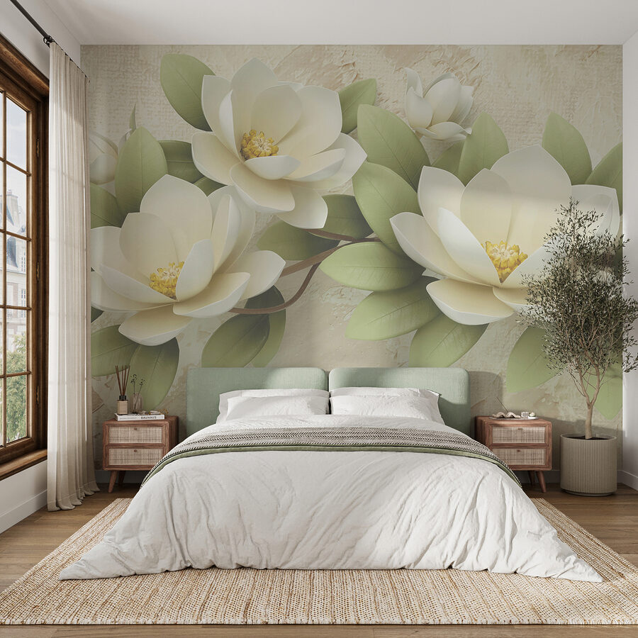 Wow, kijk eens naar die bloemen! De muurschildering “Elegante bloemen met groene bladeren” is alsof je een stukje sereniteit in je kamer hebt. Stel je voor dat je elke ochtend wakker wordt met deze grote, romige bloesems – onmiddellijk verfrissend, toch? Het is alsof je de charme van een lentetuin in huis haalt zonder het onderhoud. Perfect voor wie houdt van een vleugje natuur, maar niet echt een groene vingers heeft.